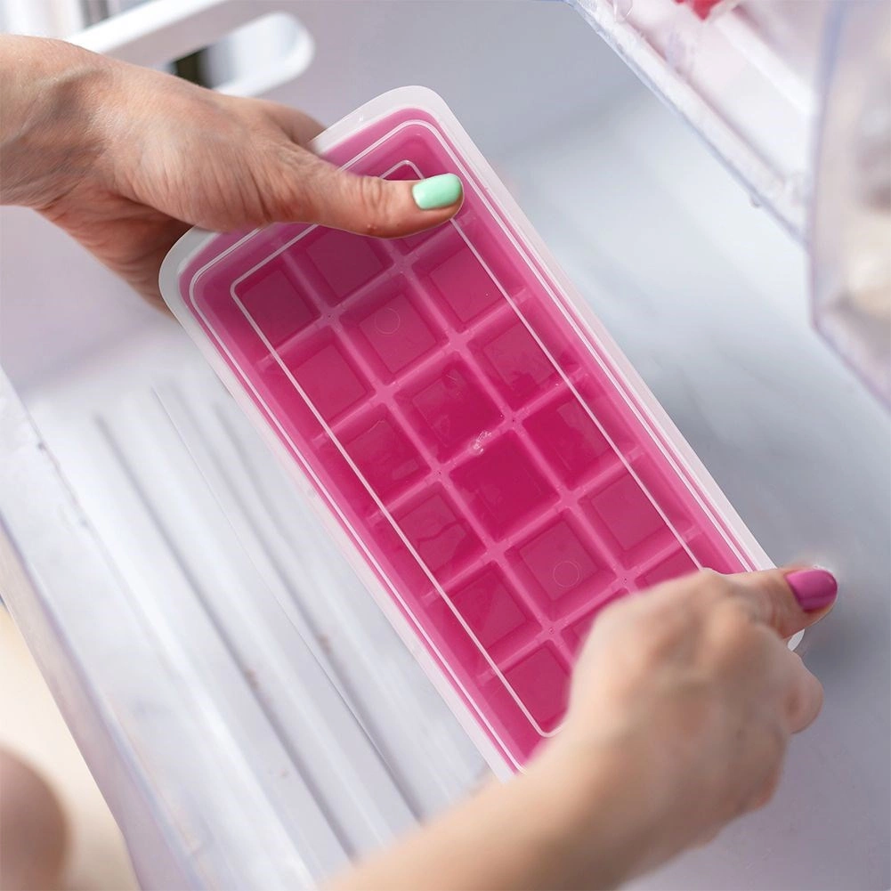 A forma rugalmas alja megkönnyíti akár 18 kocka erőfeszítés nélküli kioldását. A fedél megakadályozza a víz kiömlését a fagyasztóba helyezéskor.