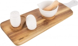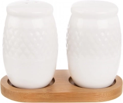 A WHITELINE 3 részes készlet a letisztult dizájnt és a praktikusságot ötvözi. A két fehér, elegáns, préselt mintás porcelán fűszertartó minőségi bambusz talapzaton kapott helyet, amely rendet tart a konyhapulton és az étkezőasztalon egyaránt. A diszkrét adagolónyílásoknak köszönhetően főzéskor és tálaláskor is pontos mennyiségű sót és borsot szórhat.