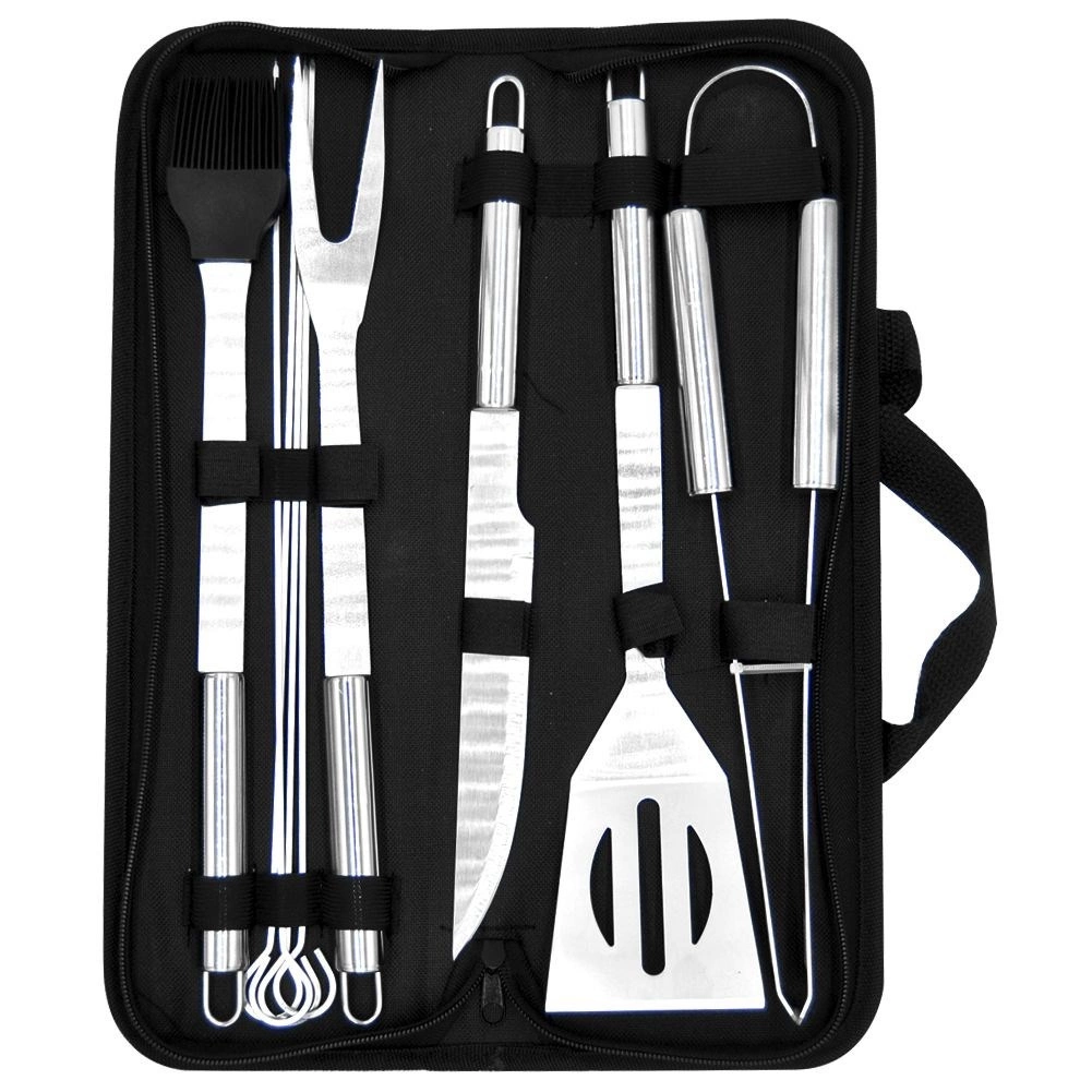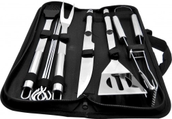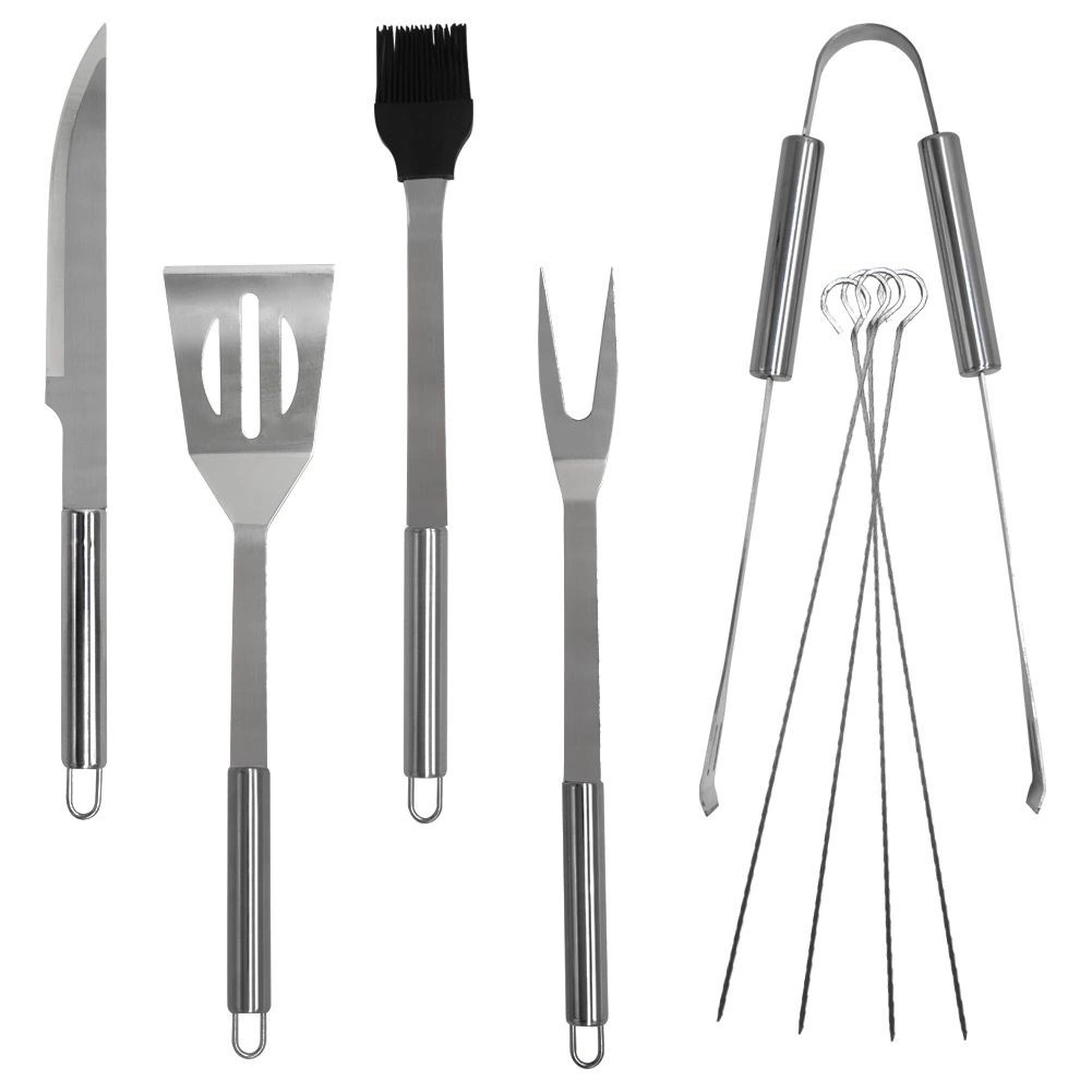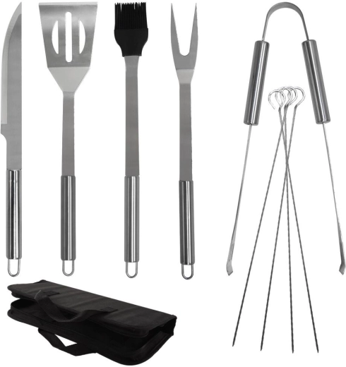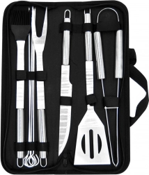 Ez a sokoldalú, 10 darabos készlet lefedi az összes igényt a grillnél és a konyhában is. A csomag tartalmaz egy éles élű lapátot a rácson történő könnyű szeleteléshez, villát, fogót, kést, kenőecsetet és 4 nyársat húsokhoz vagy zöldségekhez. Mindez egy füles, cipzáras textiltokban kapott helyet a hordozás és az áttekinthető rendszerezés érdekében.