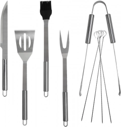 Éles élű lapát, villa, fogó, kés, kenőecset és 4 nyárs – minden, ami a grillezéshez és a tálaláshoz szükséges.