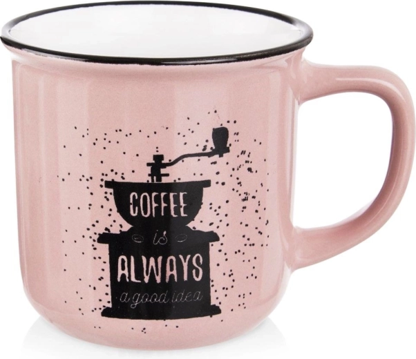 Rózsaszín máz finom pöttyös hatással, fekete perem és kávédarálós dekor „Coffee is always a good idea” felirattal – egyedi bájt kölcsönöz a konyhának.