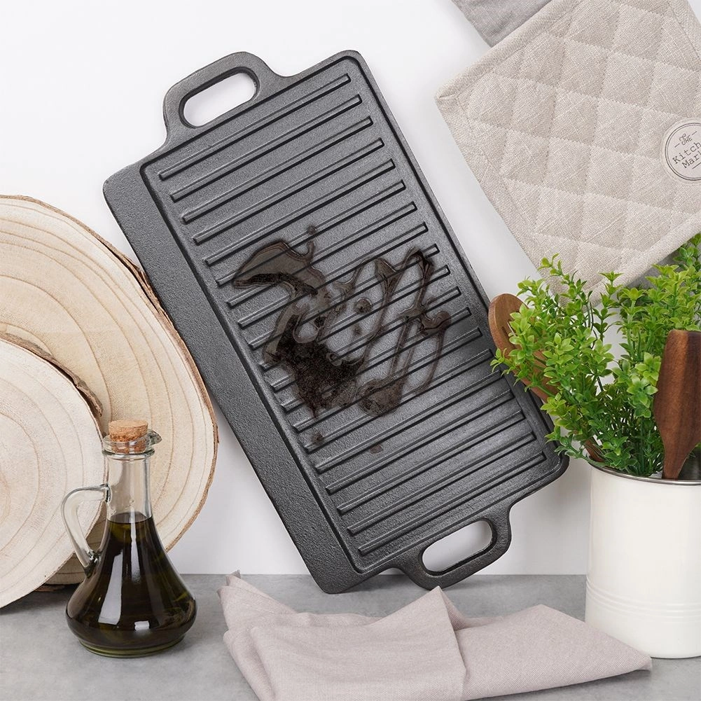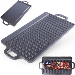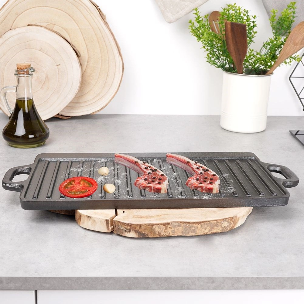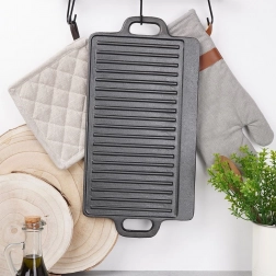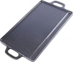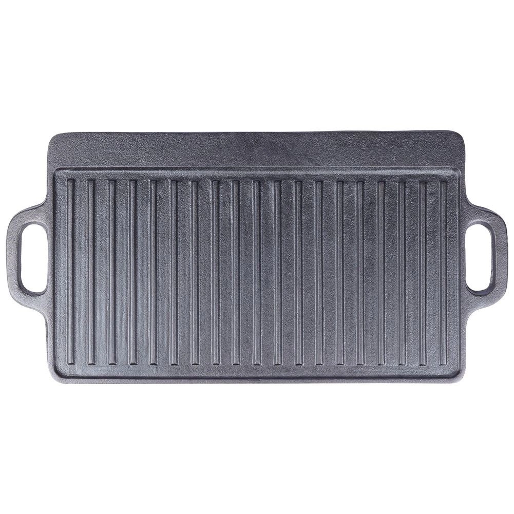 Univerzális, öntöttvas grilllap tökéletes steakhez, halhoz és zöldségekhez. Kétoldalas kivitel – simított és bordázott oldal – így mindent elkészíthet a palacsintától a szaftos steakig. A öntöttvas test kiválóan vezeti és tartja a hőt, strapabíró, és használható tűzhelyen, sütőben, grillen és nyílt lángon, beleértve az indukciót is.