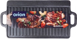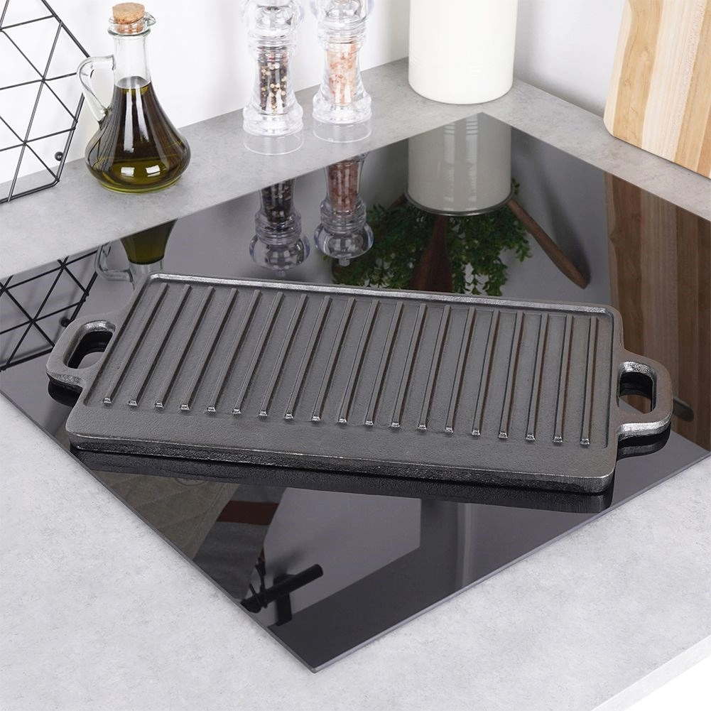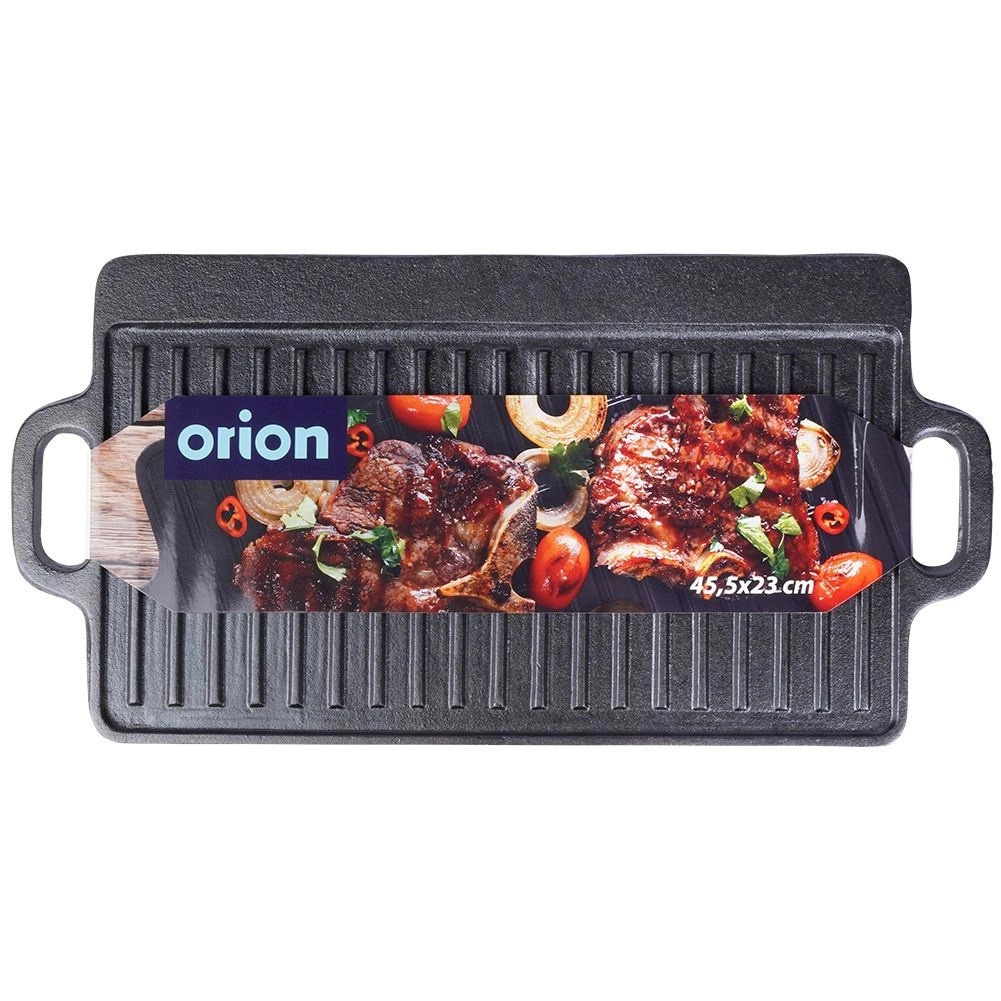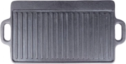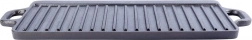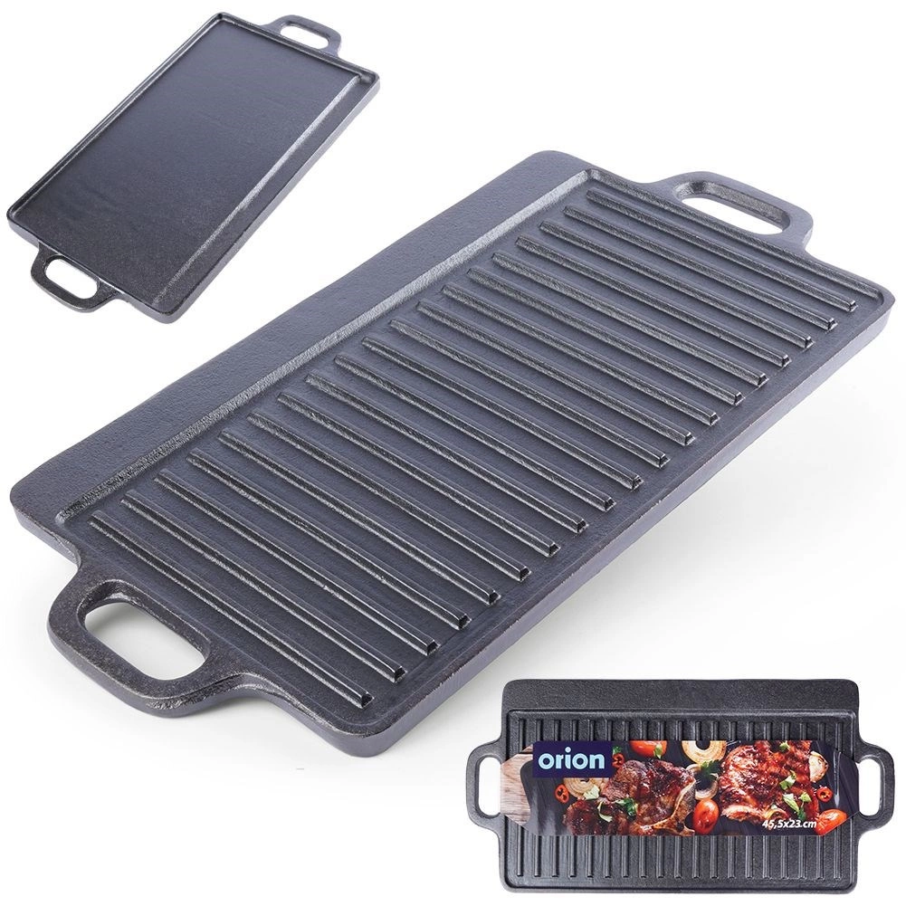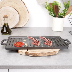 A masszív öntöttvas lap 45,5 × 23 × 1,5 cm-es méretben két munkafelületet kínál: simát sütéshez, pirításhoz és grillhez lenyomatok nélkül, valamint bordázottat karakteres rácsmintához és a felesleges zsír elvezetéséhez. A magas hőakkumulációnak köszönhetően egyenletes átsülést és kültéri grillhez hasonló ízeket érhet el.