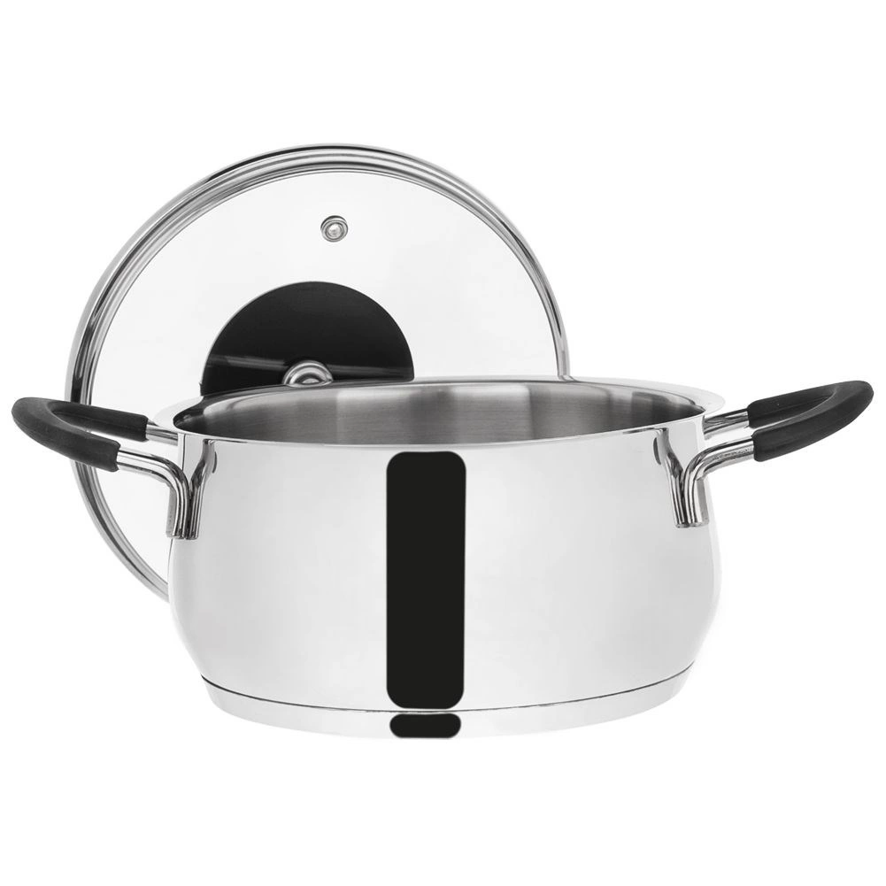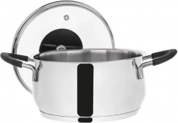 Prémium rozsdamentes acél DALIE fazék 16 cm átmérővel és 1,8 l űrtartalommal, üvegfedővel – ideális mindennapi főzéshez és pároláshoz. Kiváló minőségű 18/10 rozsdamentes acélból készült, külső polírozott és belső szatinált felülettel, gyors és egyenletes hőeloszlást, energiatakarékos akutermikus aljat és ergonomikus, nem melegedő szilikon bevonatú fogókat kínál. Minden tűzhelytípushoz alkalmas, beleértve az indukciót is, és fedő nélkül sütőben is használható (200 °C-ig).