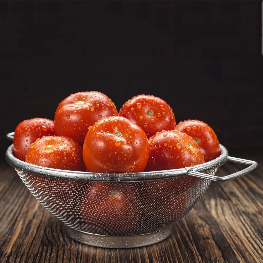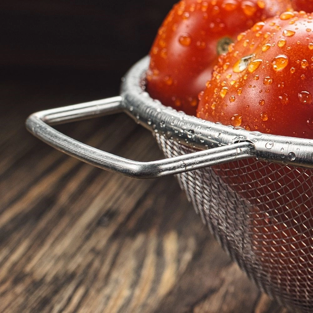 A finom rozsdamentes acél háló megbízhatóan felfogja az apró ételdarabokat is, miközben gyors vízelvezetést biztosít – ideális rizshez, tésztához és apró gyümölcsökhöz.