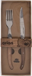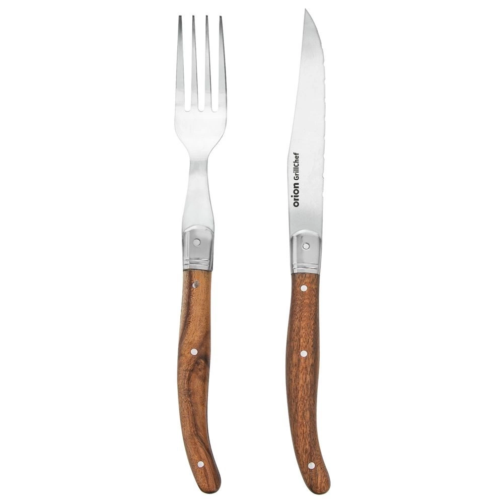 Elegáns steak kés és villa egy személynek, minőségi rozsdamentes acél éllel és ergonomikus fa nyéllel. Ideális steakhez, burgerhez és grillezéshez. A fogazott élű kés a keményebb húsokkal is megbirkózik, az akácfából készült markolatok kényelmes és stabil fogást biztosítanak.