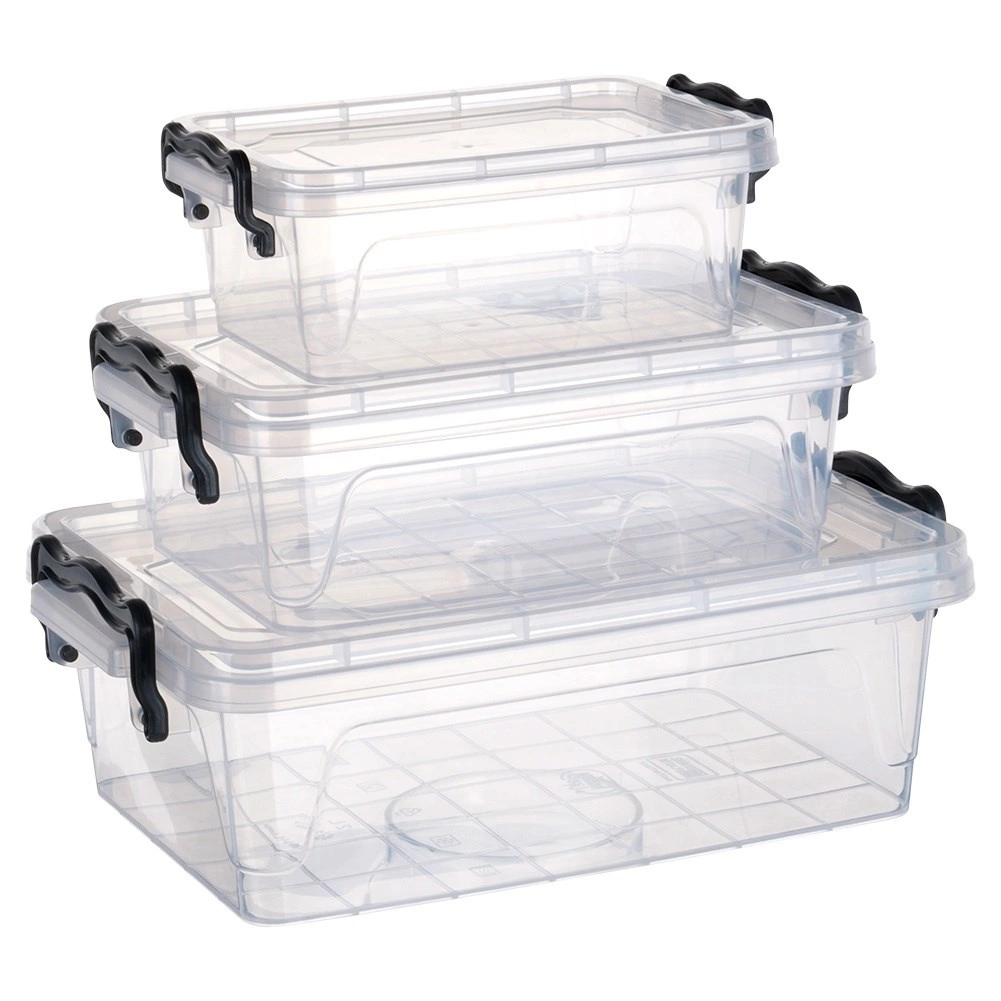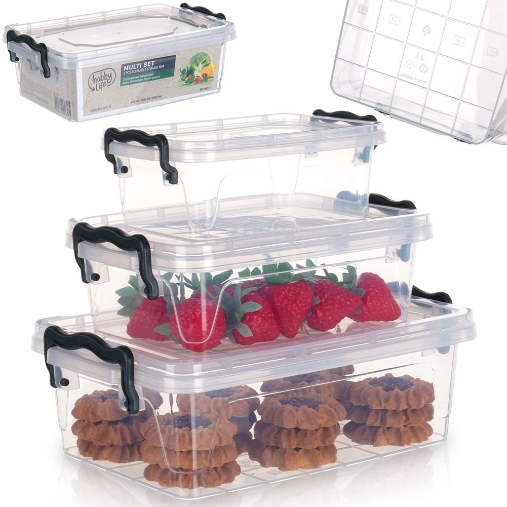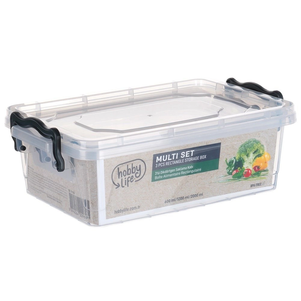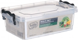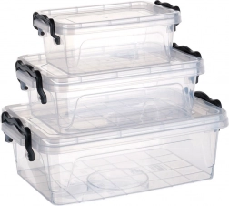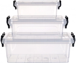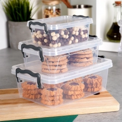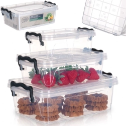 Három darab, tartós, minőségi átlátszó műanyagból készült doboz, amelyekkel mindig szem előtt tarthatja a tartalmat, és rendet tarthat a konyhában. A két oldalsó klippel ellátott, masszív fedelek szoros zárást és az ételek hosszabb frissességét biztosítják.