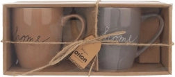 Elegáns, két darabból álló porcelán bögrekészlet 380 ml űrtartalommal, ajándékcsomagolásban. Mindennapos használatra alkalmas, kényelmes füllel és modern, Home feliratú dizájnnal. Mosogatógépben mosható és mikrohullámú sütőben használható. Ideális kávéhoz, teához és kakaóhoz is.