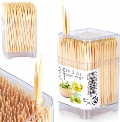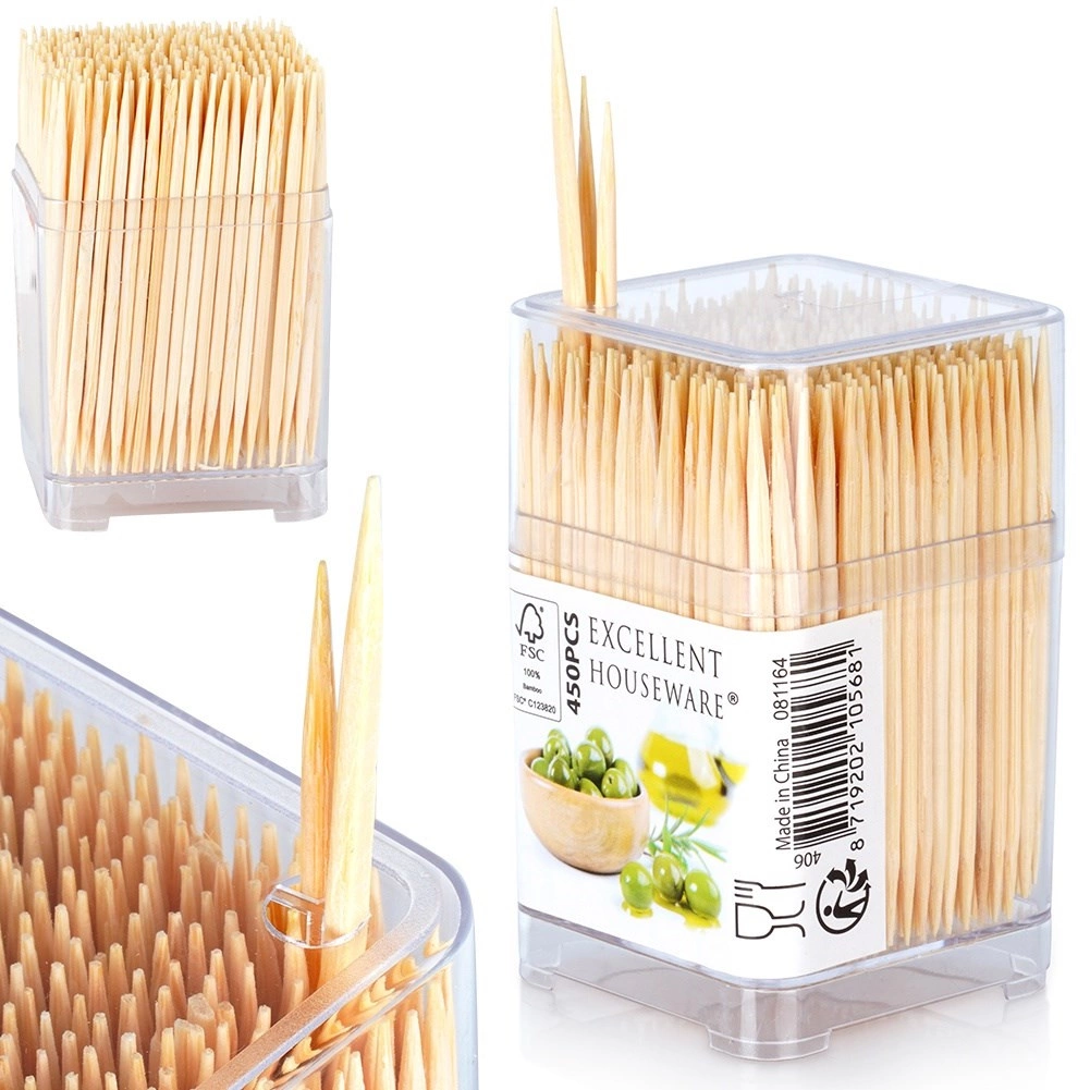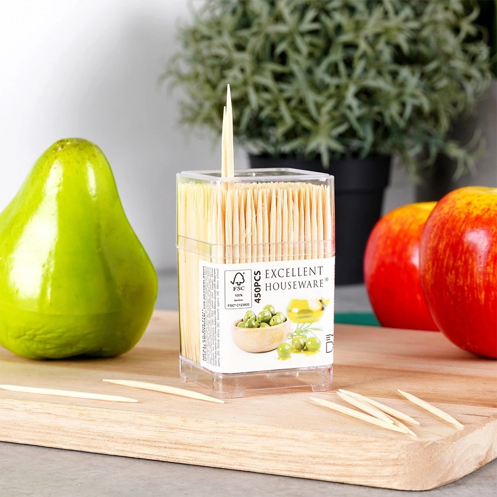 Praktikus készlet kompakt adagolóban lévő bambusz fogvájókból. Tartalmaz 450 db kétoldalt kihegyezett fogvájót 6,5 cm hosszban, ideális falatkák tálalásához, tapasokhoz és étkezés utáni higiéniához. Az természetes bambuszfából készült, egyszer használatos kivitel tiszta és könnyen használható.