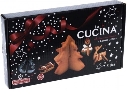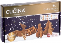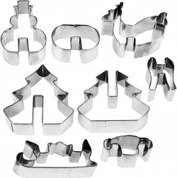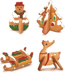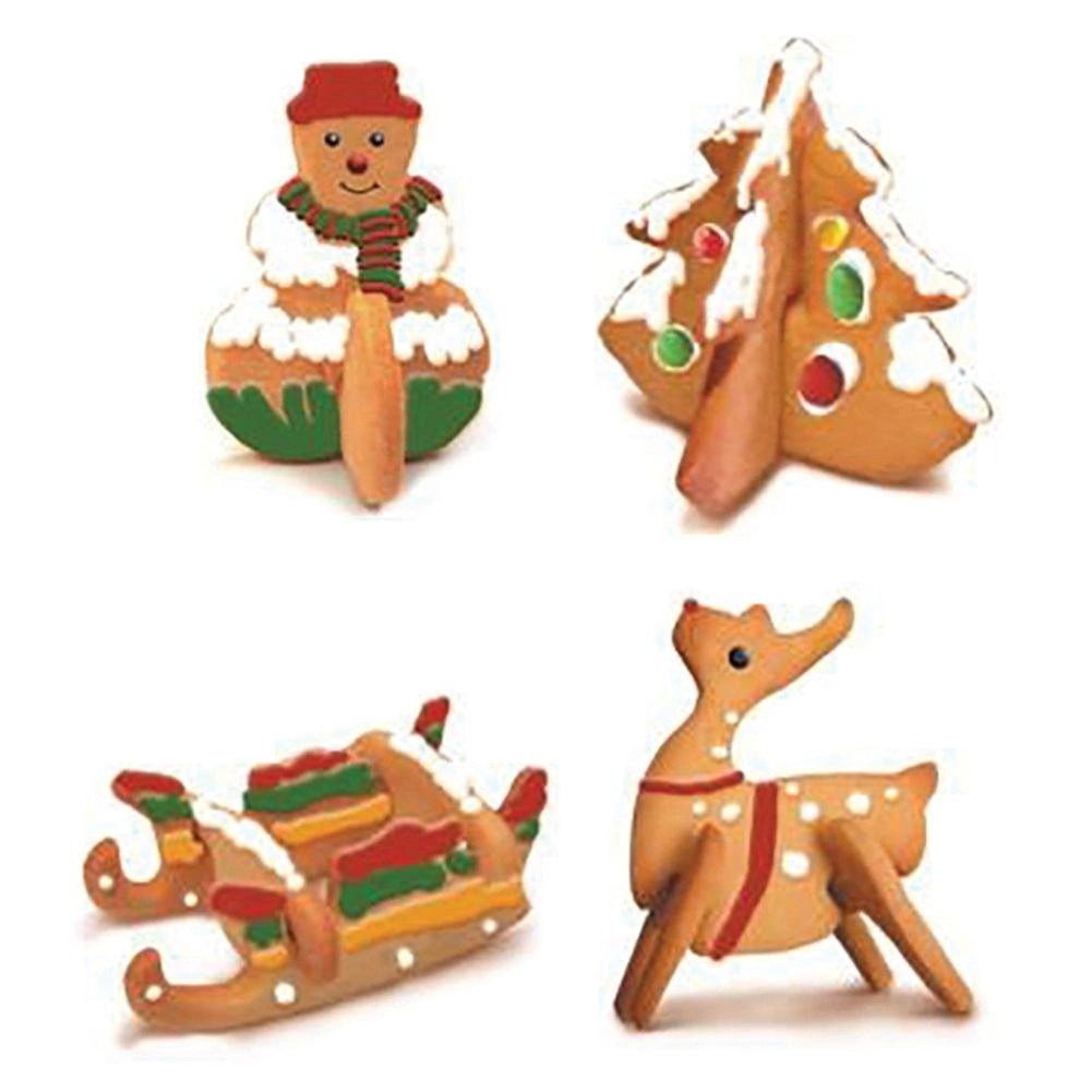 A készlet olyan darabokat szaggat ki, amelyek sütés után egymásba illeszkednek, és álló figurákat alkotnak – fenyőfa, hóember, rénszarvas és szán. Ideális ünnepi sütéshez és dekoráláshoz.