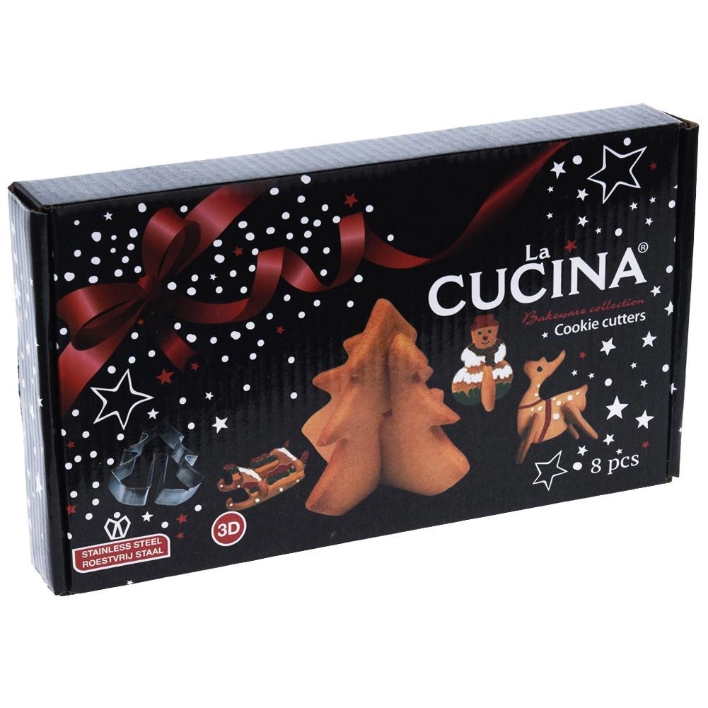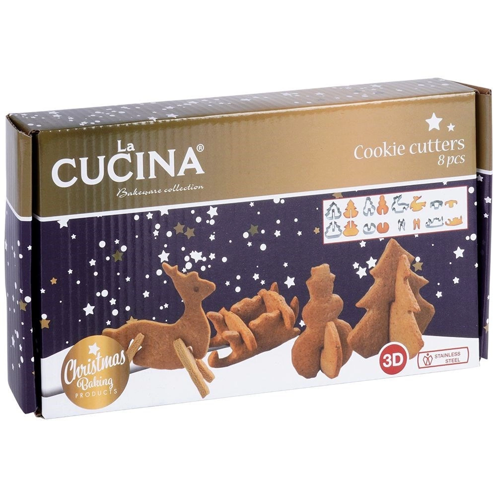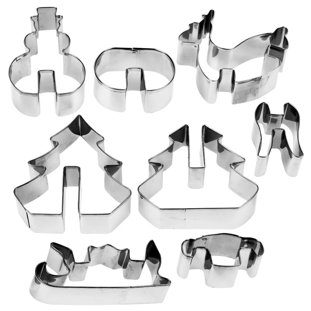 A készlet 8 darabot tartalmaz 4 különböző 3D motívum elkészítéséhez: karácsonyfa, hóember, rénszarvas és szán. Az egyes elemek mérete megközelítőleg 4,5–9,5 cm szélességben és 3,5–8,5 cm hosszban mozog. A szaggatók sokoldalúak – fondanthoz és modellező masszákhoz is alkalmasak torták és desszertek díszítéséhez.