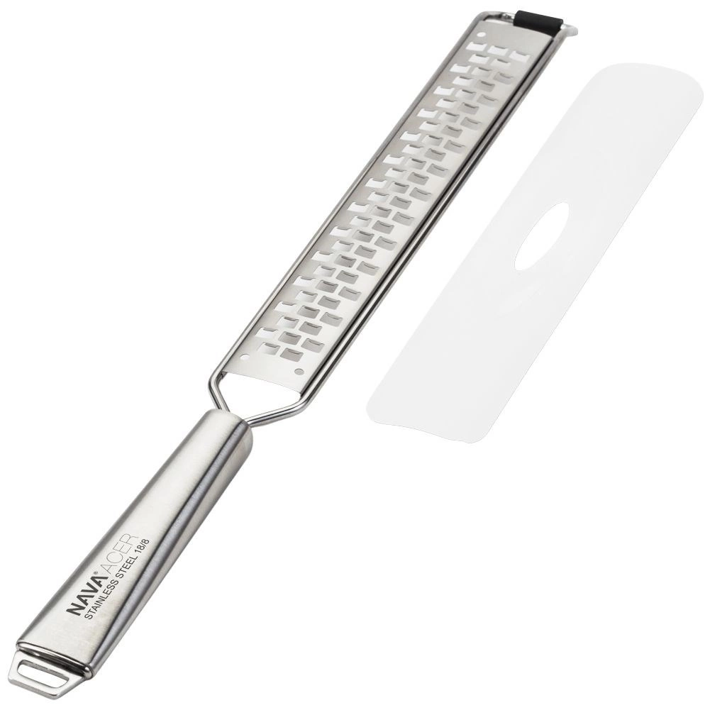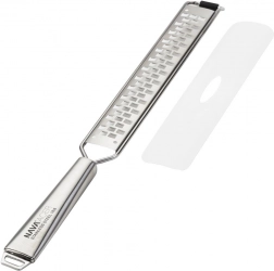 A NAVA Acer sorozat univerzális rozsdamentes acél reszelője precíz, finom csíkokra és pehelyre reszel. A hosszú test finom fogaival megbirkózik a parmezánnal, a citrusok héjával, a fokhagymával, a csokoládéval, valamint olyan fűszerekkel, mint a gyömbér, a fahéj vagy a szerecsendió. Az alsó gumivég védi az edényeket a karcolásoktól és növeli a stabilitást munka közben.
