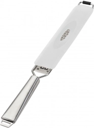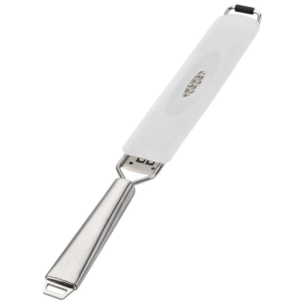 Tartós 304-es (18/8) rozsdamentes acélból készült a hosszú élettartam és a könnyű karbantartás érdekében. Az ergonomikus nyél akasztónyílással megkönnyíti a tárolást, míg a védőkupak óvja az élt és a fiókban lévő többi eszközt. A reszelő mosogatógépben mosható.