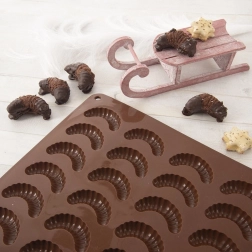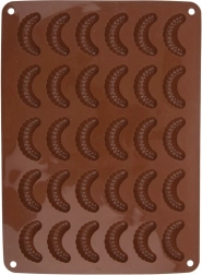 Ez az univerzális szilikon forma narancssárga színben ideális kifli alakú kekszek sütéséhez, de csokoládék és pralinék készítéséhez is. Könnyű, rugalmas, helytakarékos a konyhában, és kiváló hővezetésének köszönhetően egyenletesen átsül. Anyaga nem veszi át a szagokat és ízeket, a kész darabok pedig könnyen kivehetők.