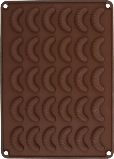 Praktikus szilikon forma ropogós kiflik sütéséhez, mellyel egyszerre akár 30 darabot készíthet 5,5 cm hosszúságban. -40 és +220 °C közötti hőmérsékletnek ellenáll, sütőben, mikrohullámú sütőben és fagyasztóban is használható, valamint mosogatógépben mosható. A tapadásmentes felületnek köszönhetően a tészta nem ragad, és nem szükséges zsiradékot vagy lisztet használni.