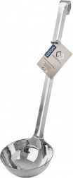 Az univerzális rozsdamentes acél merőkanál nélkülözhetetlen segítőtárs minden konyhában. A 300 ml-es űrtartalomnak köszönhetően gyorsan és pontosan merhet levest, mártást, kompótot vagy pörköltet. A hosszú nyél biztonságos és kényelmes fogást biztosít, megkönnyítve a tálalást mélyebb fazekakból is.