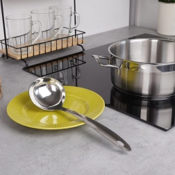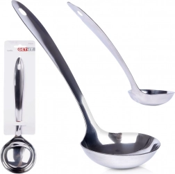 Sokoldalú rozsdamentes merőkanál, nélkülözhetetlen segítőtárs a mindennapi főzéshez és tálaláshoz. A 80 ml-es űrtartalom pontos adagolást tesz lehetővé levesekhez, mártásokhoz, kompóthoz vagy pörkölthöz. A hosszú nyél biztonságos távolságban tartja a kezeket a forró folyadékoktól, míg az akasztófül megkönnyíti a tárolást a konyhai relingen.