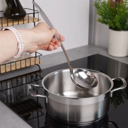 A hosszú nyél megóvja a kezet a forró gőztől, és megkönnyíti a merítést magas fazekakból is. Az akasztófül egyszerű tárolást biztosít.