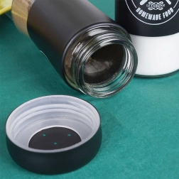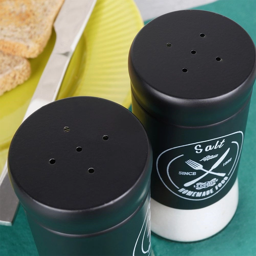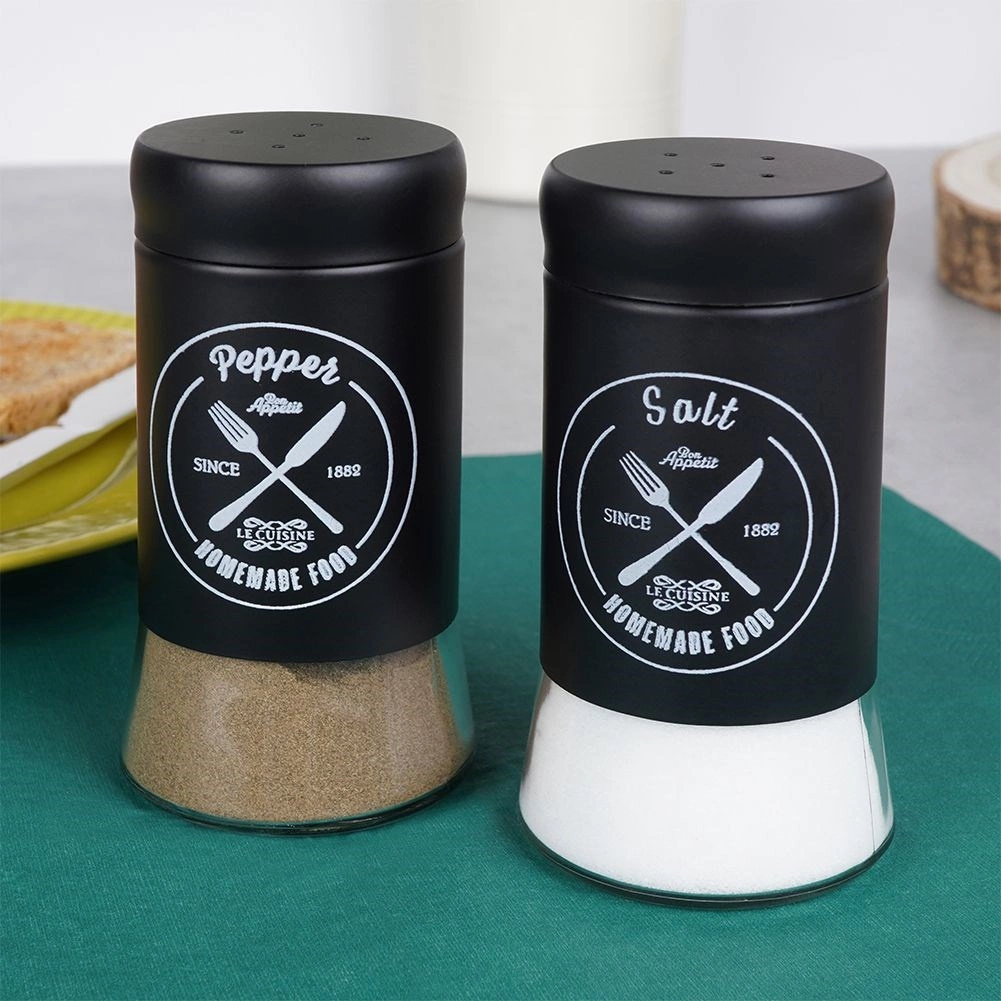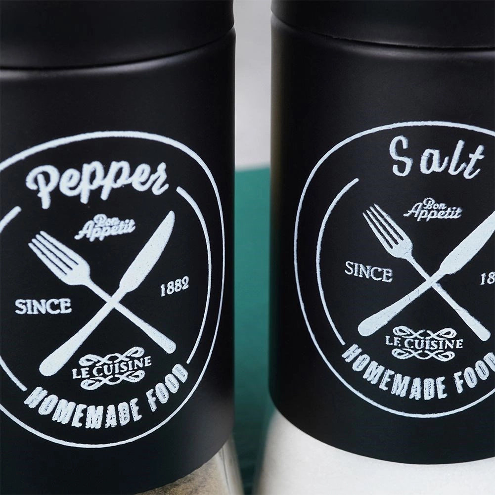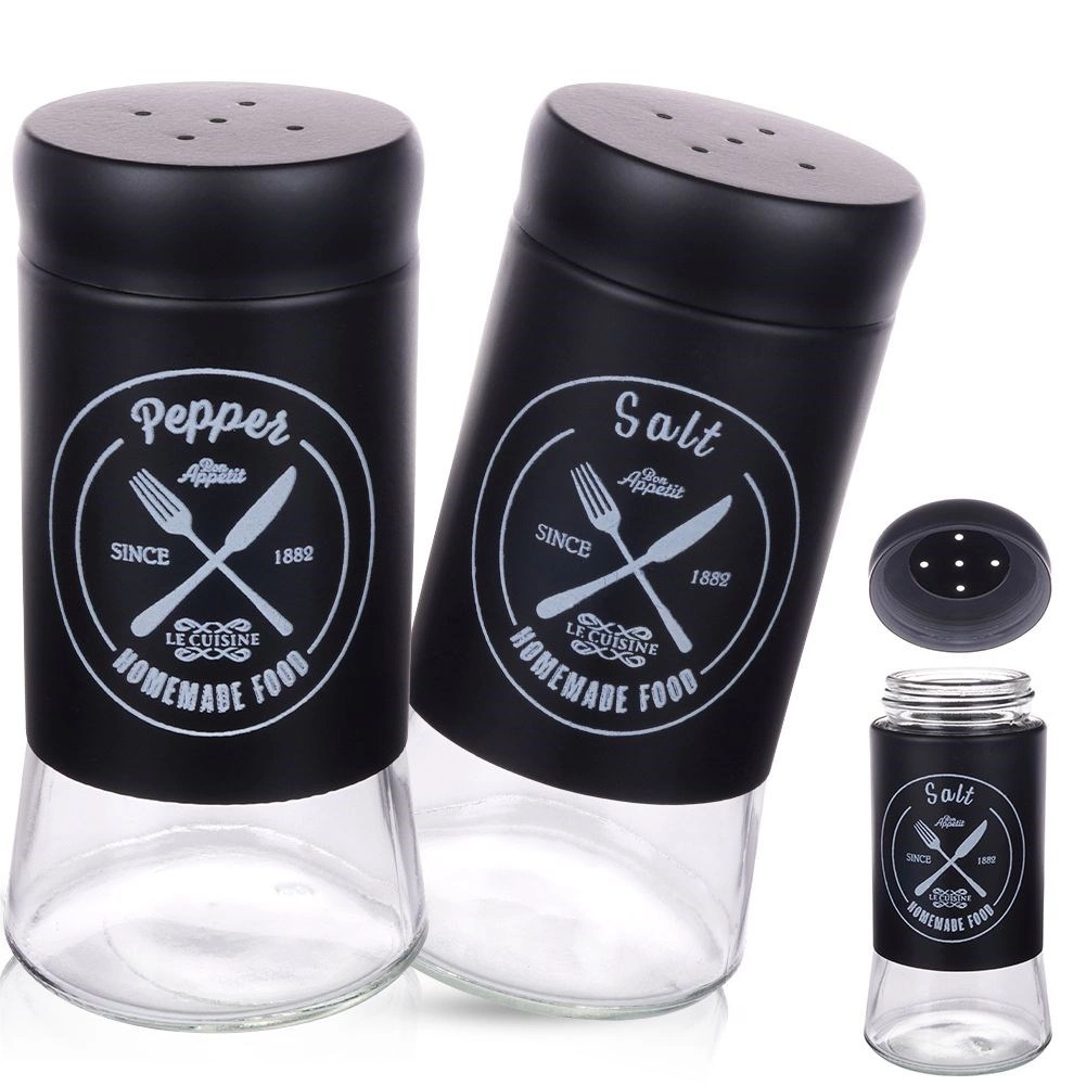Ez a só- és borsszóró készlet 5,5 × 5,5 × 11 cm-es méretben a minőségi üveget matt fekete fémmel ötvözi a stílusos megjelenés és a hosszú élettartam érdekében. Az átlátszó üvegrész azonnali mennyiségellenőrzést tesz lehetővé, míg a fehér nyomatok egyértelműen megkülönböztetik a sót és a borsot.