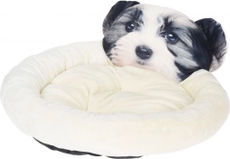 Kényelmes, 45 cm átmérőjű fekhely kis testű kutyáknak és macskáknak, mely puha, meleg pihenőhelyet kínál. Megerősített pereme támaszt nyújt a fejnek, strapabíró alja fekete szövetből készült, és a bájos kutyafej díszítés barátságosabbá teszi bármelyik otthont. Könnyű és egyszerűen hordozható – ideális otthonra és utazáshoz is.