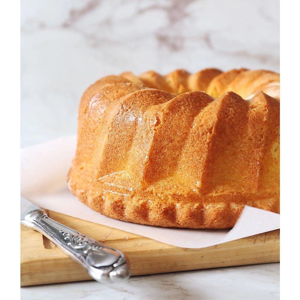 A bordázott oldalak és a középső kémény egyenletes sütést biztosítanak, és látványos, ropogós felületet adnak a kuglófnak.