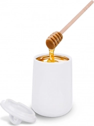 A tartó tartós, fehér porcelánból készült, a kanál pedig természetes fából, így a méz adagolása kényelmes és kíméletes.