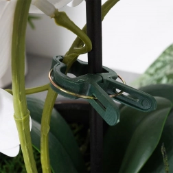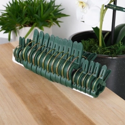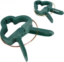 A rugós mechanizmus bordázott pofákkal erősen tart, mégsem sérti a növényt. Ideális karókhoz és támaszokhoz való rögzítéshez.