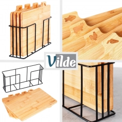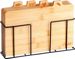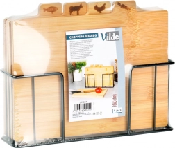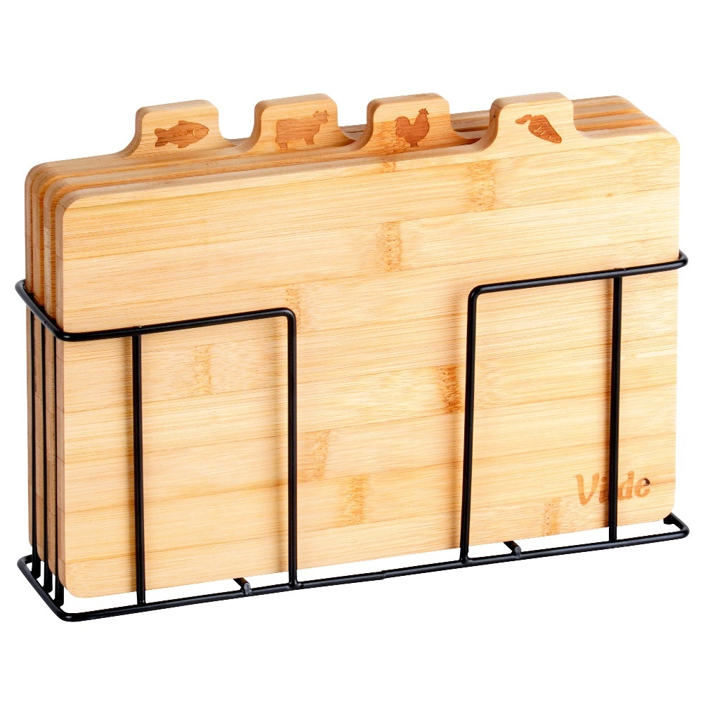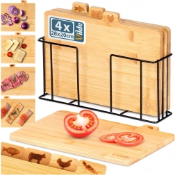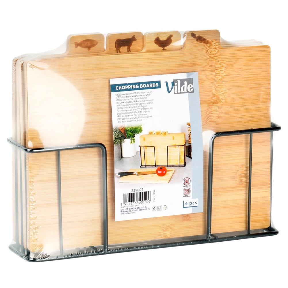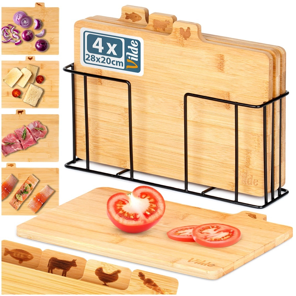 Ezzel a bambusz vágódeszka-készlettel tökéletes rendet tarthat a konyhában. A négy különálló deszkán praktikus fülek és ikonok jelzik, mire valók – zöldséghez, baromfihoz, húshoz és halhoz –, ezzel támogatva az ételek higiénikus előkészítését. A stabil, fekete színű fém tartó gondoskodik róla, hogy a deszkák mindig kéznél és rendezetten legyenek.