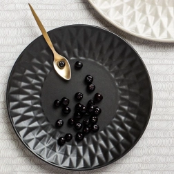 Az elegáns desszerttányér modern fekete színben időtálló formát és karakteres, domborított peremet ötvöz. A minőségi kerámia tartósságot és kényelmes mindennapi használatot biztosít, akár süteményt, desszertet, gyümölcsöt vagy kisebb falatokat szolgál fel.