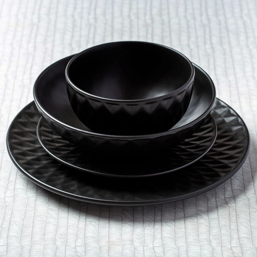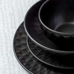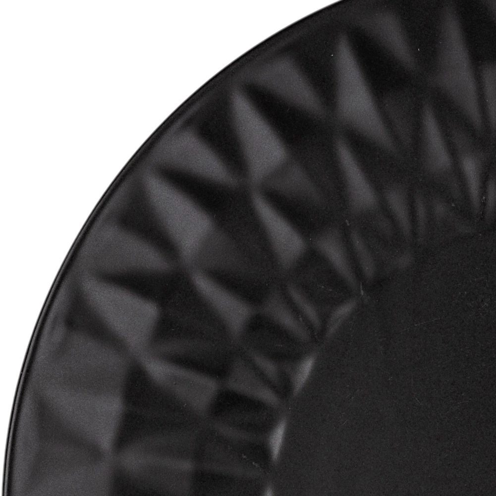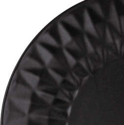 Stílusos fekete desszerttányér, 20 cm átmérővel, minőségi kerámiából, dekoratív geometrikus domborított mintázattal. Remek desszertekhez, süteményekhez és reggelihez, mosogatógépben mosható és mikrohullámú sütőben használható. A modern matt megjelenés bármely konyhában jól mutat, és tökéletesen illik a SOHO sorozat további darabjaihoz.