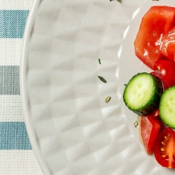 A díszítő geometrikus préselés egyedi megjelenést ad a tányérnak, és szintre emeli a desszertek és előételek tálalását.