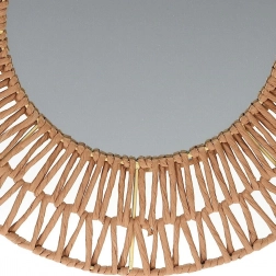 Ez a kerek fali tükör természetes stílusú, design kiegészítő. A fonott papír keret erős fém szerkezeten látványos struktúrát alkot, amely remekül érvényesül boho, skandináv vagy modern minimalista enteriőrökben. A semleges bézs–szürke tónusok könnyen kombinálhatók különféle színekkel és anyagokkal.