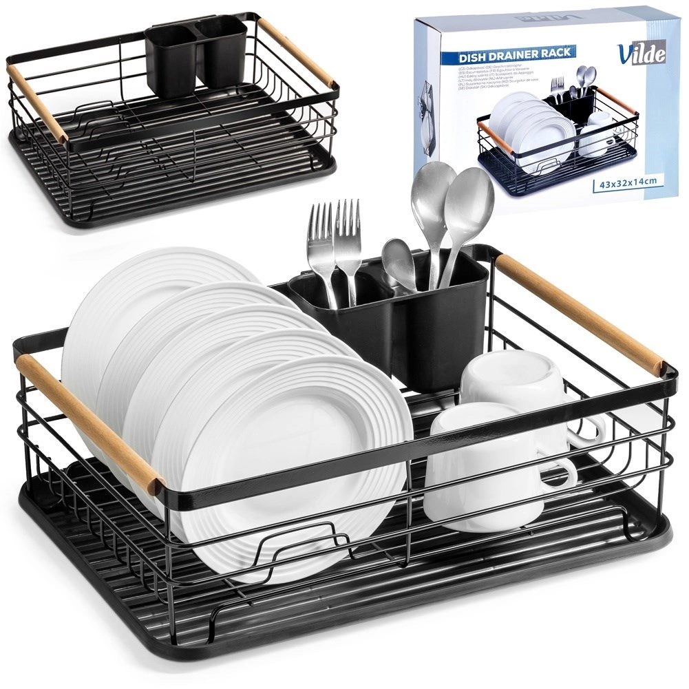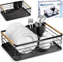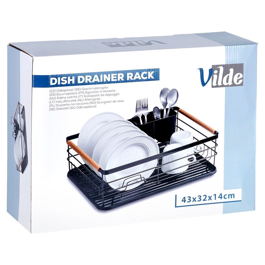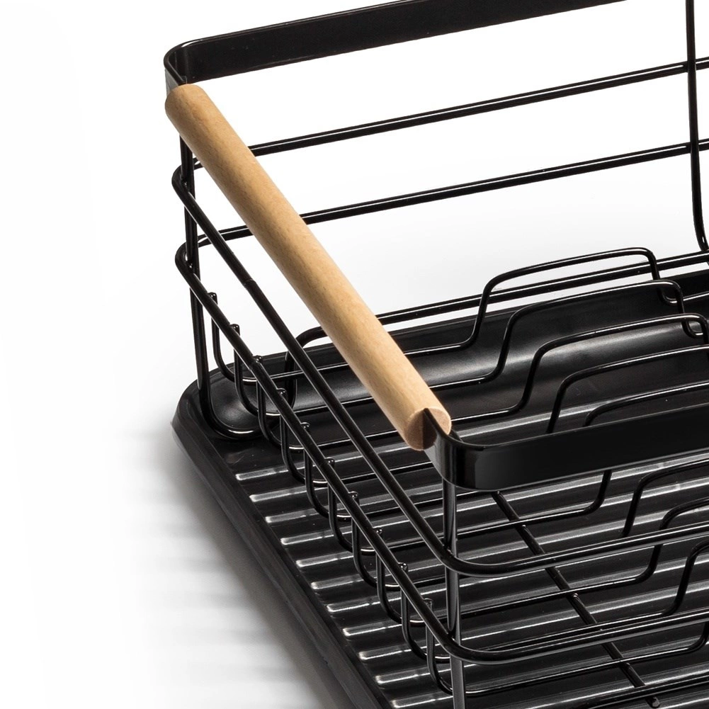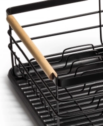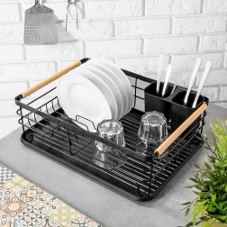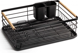Praktikus edényszárító 43 × 32 × 14,5 cm méretben, amely megkönnyíti a tányérok, poharak és evőeszközök szárítását és rendszerezését, miközben védi a konyhapultot. Tartós, fekete színű fémből készült, kivehető csepegtetőtálcával és kétrekeszes evőeszköztartóval. A legfeljebb 10 tányér kapacitásnak, a masszív drótszerkezetnek és a bambuszfa fogantyúknak köszönhetően kényelmes a hordozása és a mindennapi használata. A stílusos indusztriális design remekül illik modern és klasszikus konyhákba is.