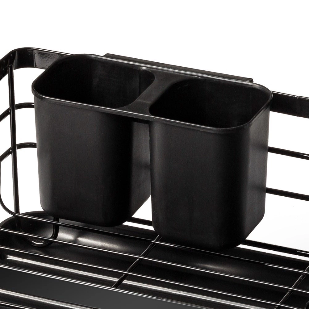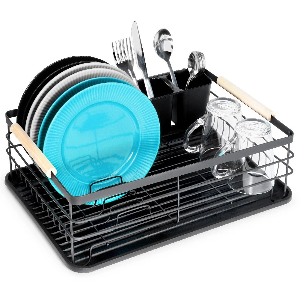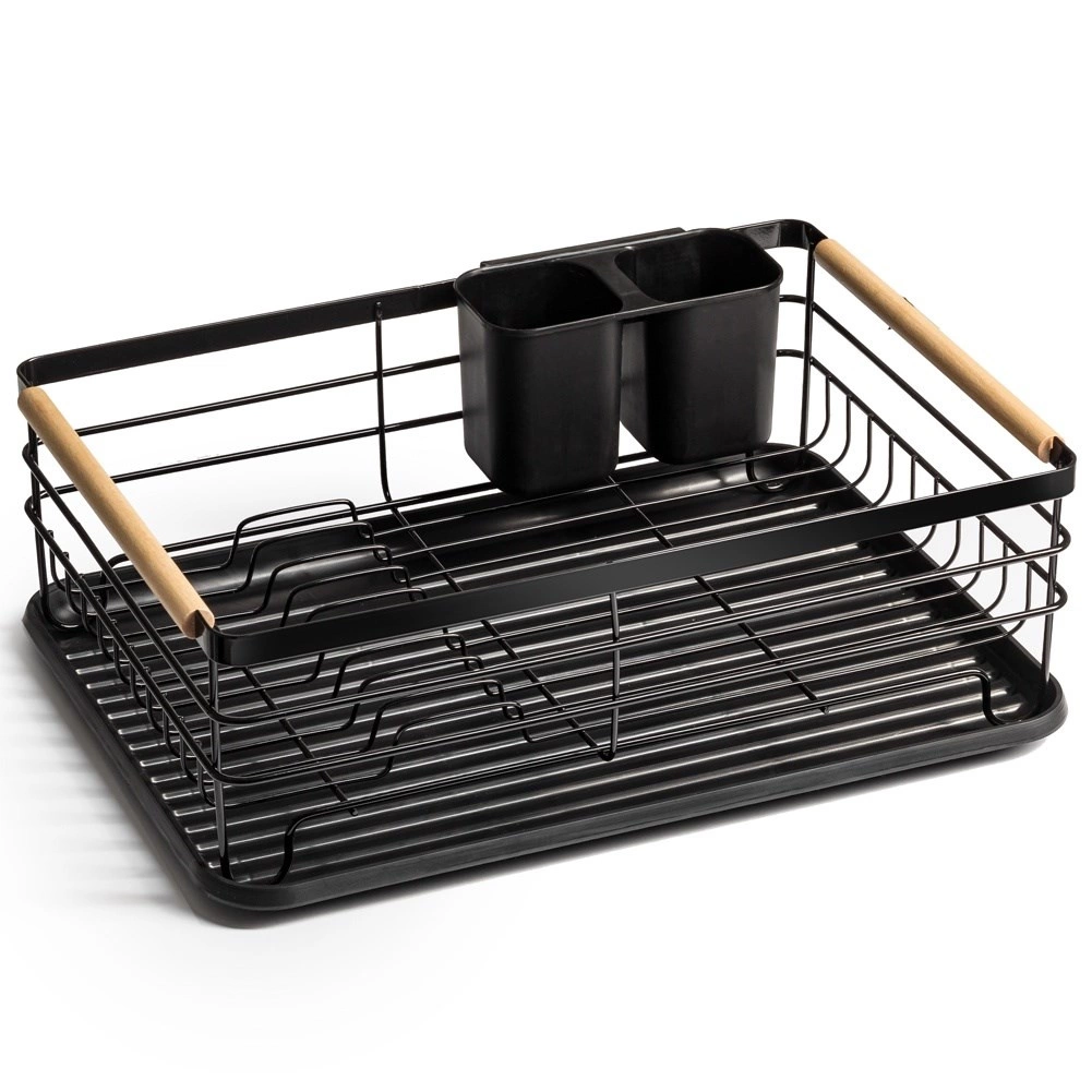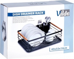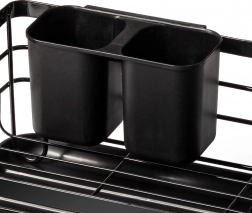 Praktikus edényszárító 43 × 32 × 14,5 cm méretben, amely megkönnyíti a tányérok, poharak és evőeszközök szárítását és rendszerezését, miközben védi a konyhapultot. Tartós, fekete színű fémből készült, kivehető csepegtetőtálcával és kétrekeszes evőeszköztartóval. A legfeljebb 10 tányér kapacitásnak, a masszív drótszerkezetnek és a bambuszfa fogantyúknak köszönhetően kényelmes a hordozása és a mindennapi használata. A stílusos indusztriális design remekül illik modern és klasszikus konyhákba is.