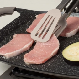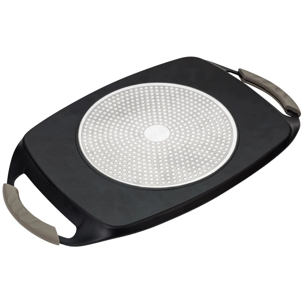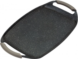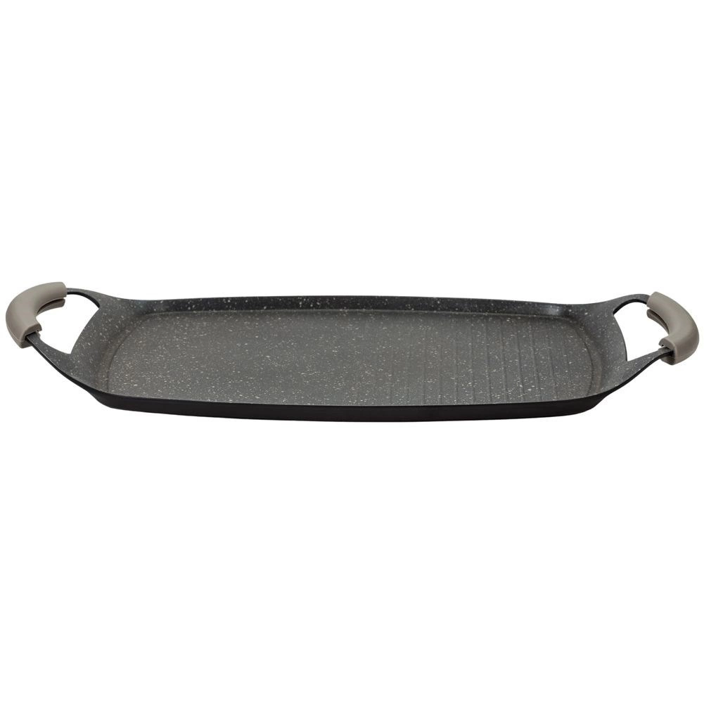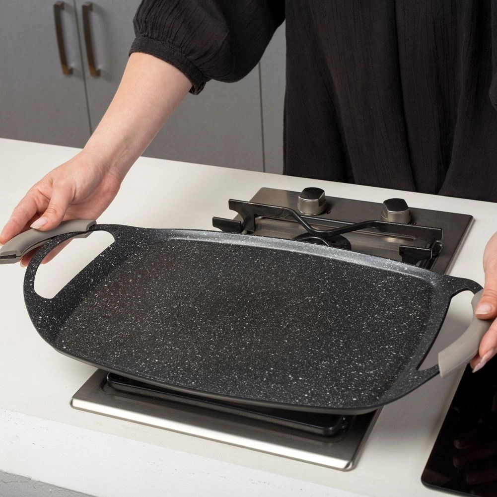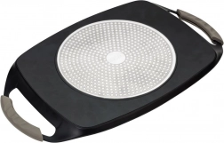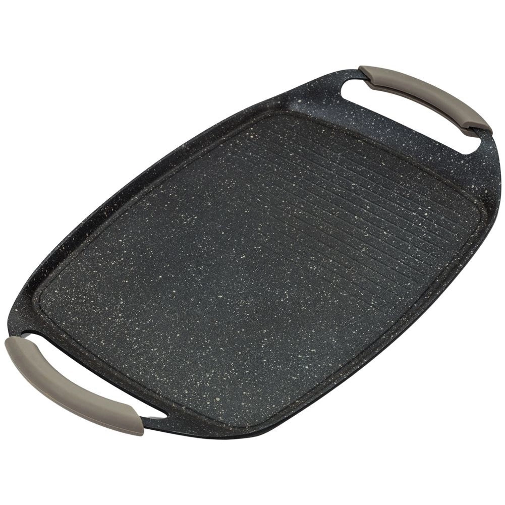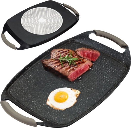 Kétzónás, mindkét oldalán használható lap – a fele sima palacsintához, tojásokhoz vagy tenger gyümölcseihez, a másik fele bordázott a markáns grillcsíkokért húsokon és zöldségeken. A masszív alumínium test ötrétegű gránit bevonattal bír, ellenáll a magas hőmérsékletnek és a hősokknak, és egyenletes átsülést biztosít odatapadás nélkül.