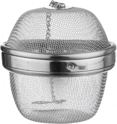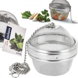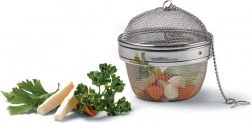 Praktikus acél fűszerszita 9 cm átmérővel és 8 cm magassággal levesek, alaplevek és teák egyszerű ízesítéséhez. A finom, sűrű szövésű háló kiengedi a fűszernövények aromáját és ízét, miközben visszatartja a darabkákat. Minőségi rozsdamentes acélból készült, pattintós zárral és akasztóhorgos lánccal, amely megkönnyíti az edény vagy kancsó peremére akasztást.