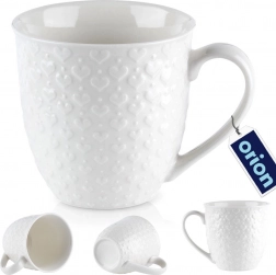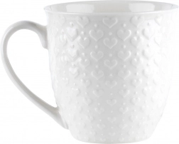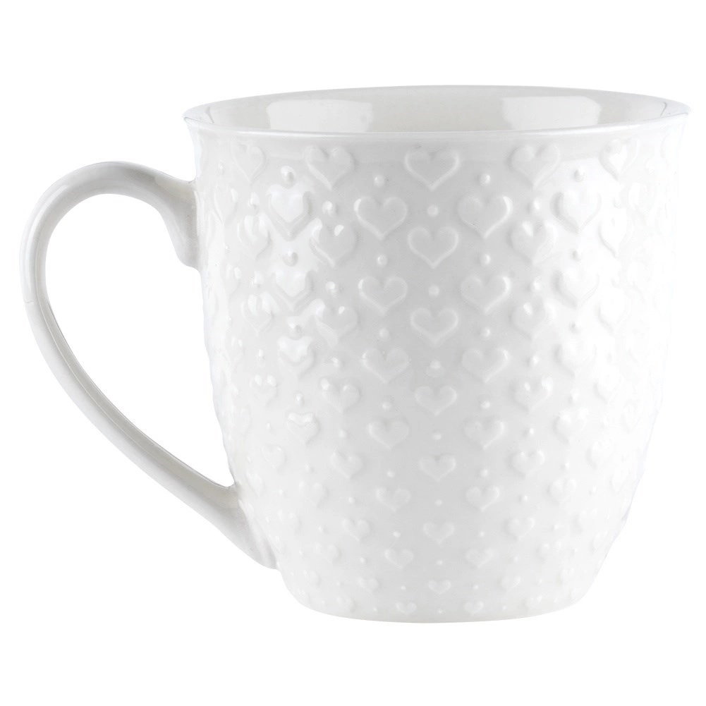 Nagy, fehér kerámia bögre 580 ml űrtartalommal, ideális mindennapi kávé- vagy teakortyolgatáshoz. Kényelmes füllel, stílusos szívecskés domború mintával, és a minőségi kerámiának köszönhetően mikróba és mosogatógépbe is alkalmas. Remek ajándék és praktikus kiegészítő minden konyhába.