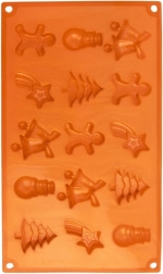 - Karácsonyi motívumok – 5 forma (emberke, fenyő, hóember, csillag, csengő), összesen 15 darab egy tepsin.