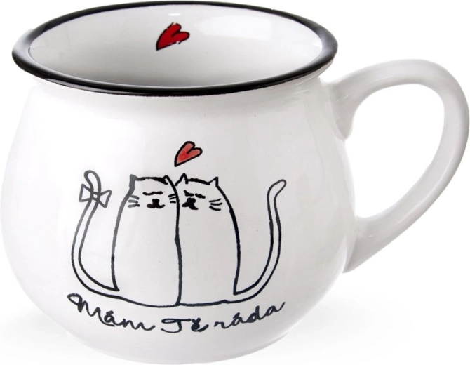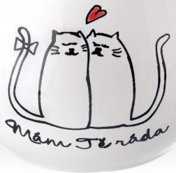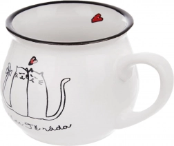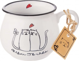 Stílusos, 300 ml űrtartalmú kerámia bögre szerelmes macskamotívummal, ideális kávéhoz, teához és kakaóhoz. Kényelmes füllel rendelkezik, mosogatógépben mosható és mikrohullámú sütőben használható, a minőségi fehér kerámia pedig hosszú éveken át szolgálja önt.