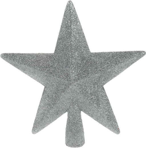 Elegáns fa csúcsdísz csillogó ezüst csillag formában, 19 × 19,5 cm méretben, amely ünnepi ragyogást kölcsönöz a fának. Tartós, törhetetlen műanyagból készült, így biztonságos gyerekek és háziállatok mellett is, a praktikus rögzítőrésznek köszönhetően pedig könnyen és stabilan felhelyezhető a fa tetejére.