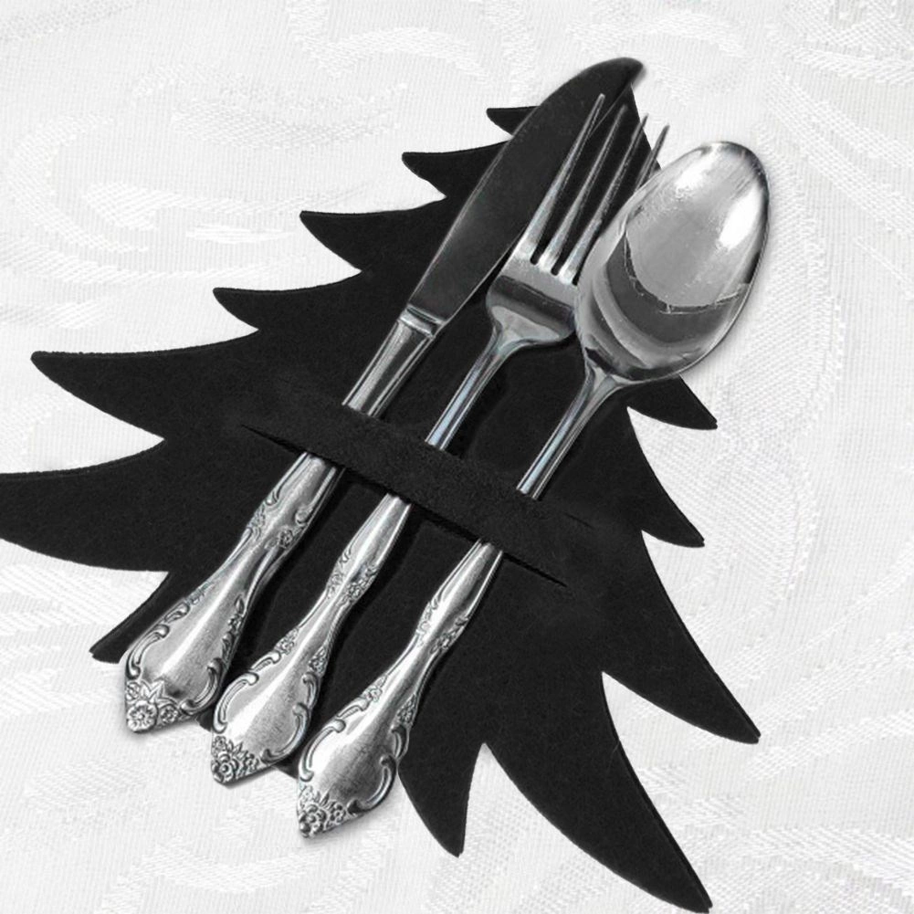 Teremtsen egyedi karácsonyi hangulatot otthonában a fácska alakú evőeszköztartó tokokkal. A fekete filc modern, kontrasztos megjelenést ad az asztalterítésnek, és bármilyen ünnepi dekorációhoz és étkészlethez illik. A praktikus nyílások megbízhatóan tartják az egész evőeszközkészletet, és elegánsan mutatják be azt.
