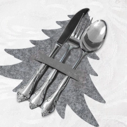 Adjon egyedi fényt az ünnepi asztalterítésnek. Az elegáns, szürke, filcből készült, karácsonyfa alakú evőeszköztartók kiemelik a terítéket és egyben tartják az evőeszközöket. Az okos kivágásoknak köszönhetően a behelyezés és kivétel gyors és kényelmes, a zseb három nagy darabot – kanál, villa és kés – fogad.