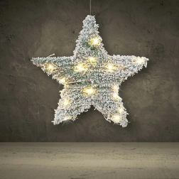 Stílusos, 30 cm átmérőjű világító csillag, amely varázslatos karácsonyi hangulatot teremt a belső térben. Ötvözi a meleg fehér LED világítást (20 dióda), a havas hatású tűlevelű megjelenést fonott kereten, valamint a praktikus időzítő funkciót. Akasztható vagy állítható, ideális falra, ablakba vagy komódra.