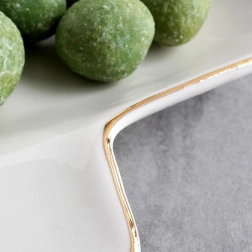 A fényes fehér máz és a visszafogott arany szegély időtálló, ünnepélyes megjelenést ad a tányérnak.
