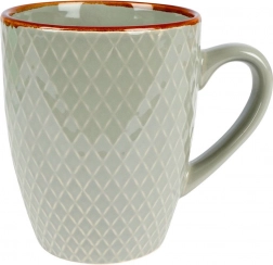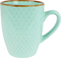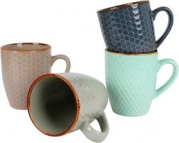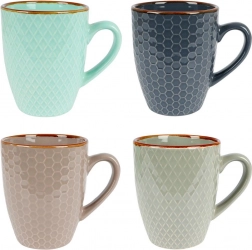 Minden bögrét plasztikus geometrikus minta és kontrasztos barna perem díszít. A négy vonzó szín elegáns megjelenést ad konyhádnak, és könnyen összehangolható más edényeiddel.