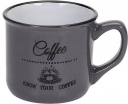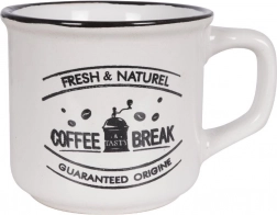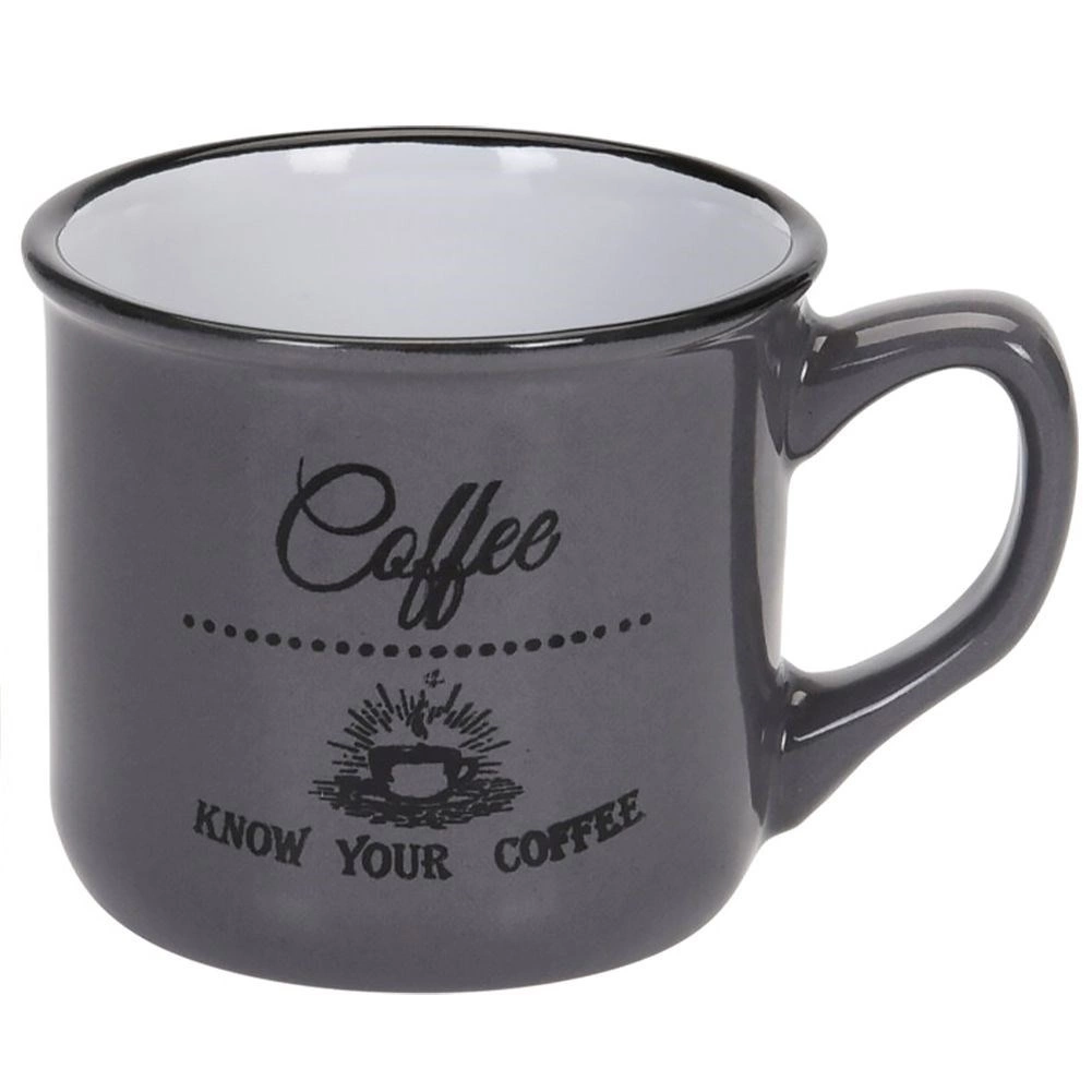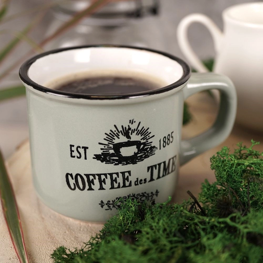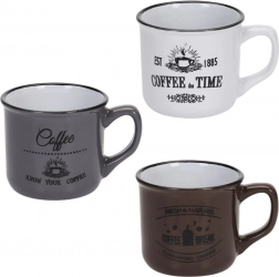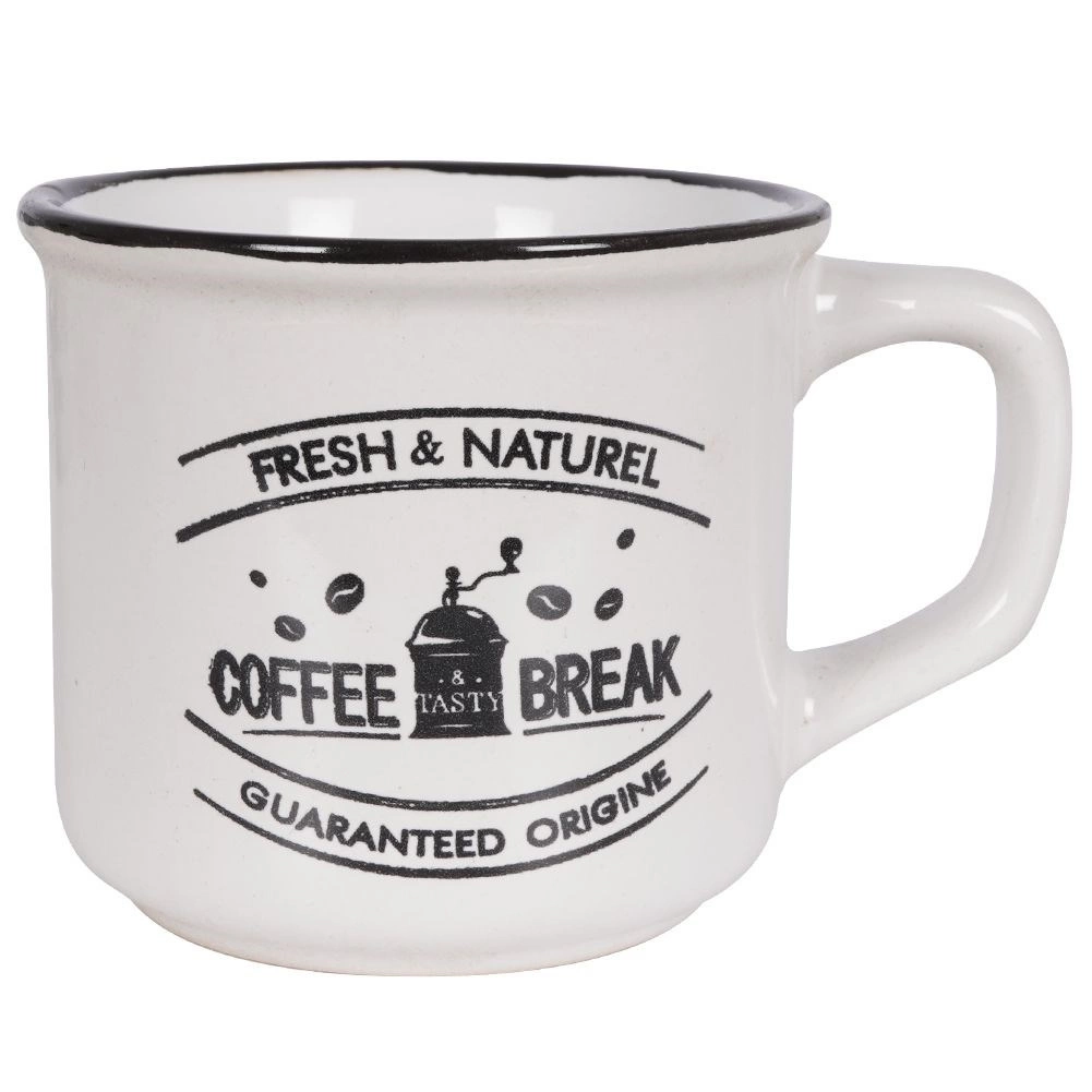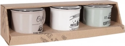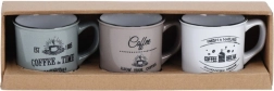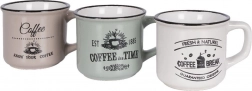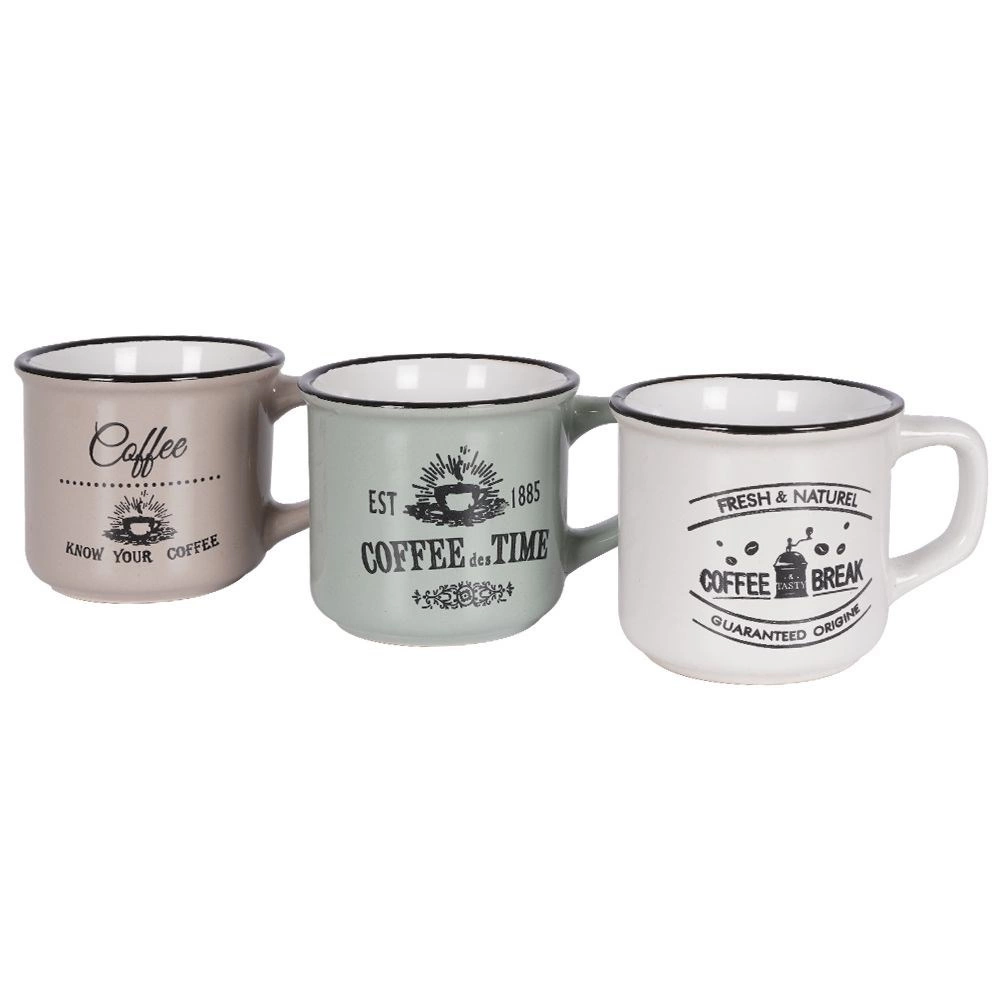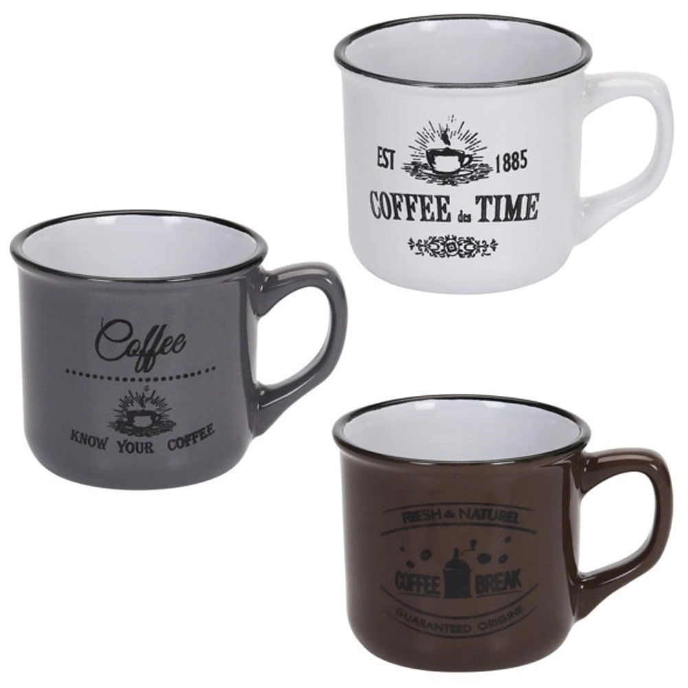 Stílusos, három darabból álló kerámia bögrekészlet 160 ml űrtartalommal a mindennapi kávéhoz, teához vagy kakaóhoz. Kínál minőségi kerámiát, kényelmes fület, mosogatógépben moshatóságot és mikrohullámú sütőben melegíthetőséget. A vintage kávés nyomatoknak és a fekete peremnek köszönhetően remekül illik modern és rusztikus terítékhez egyaránt.