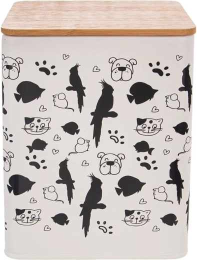 Stílusos, 1,7 l űrtartalmú fém tároló, amely a száraztápot és jutalomfalatokat sokáig frissen tartja. Szilikon gyűrűs, jól záró bambusz fedéllel rendelkezik, strapabíró, és fehér színe fekete állatmintával dekoratív kiegészítője bármely konyhának.