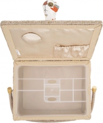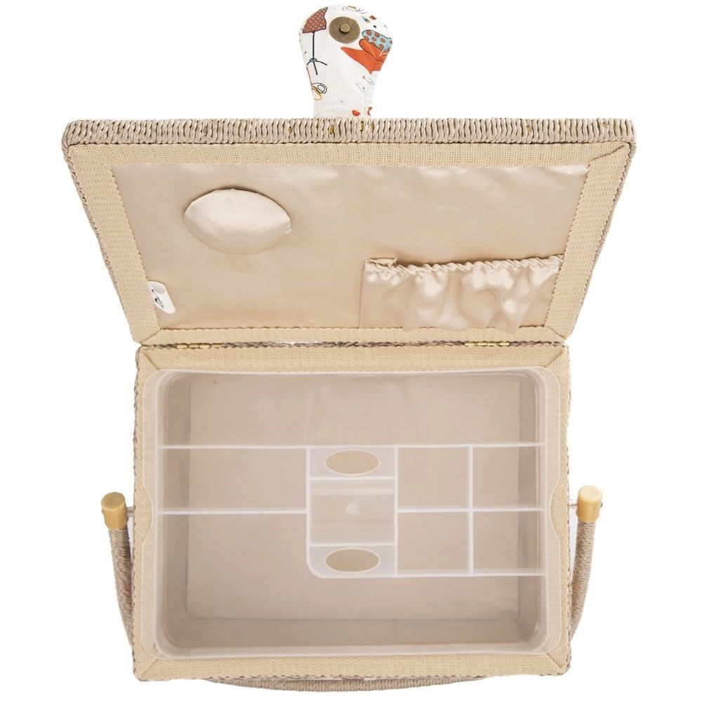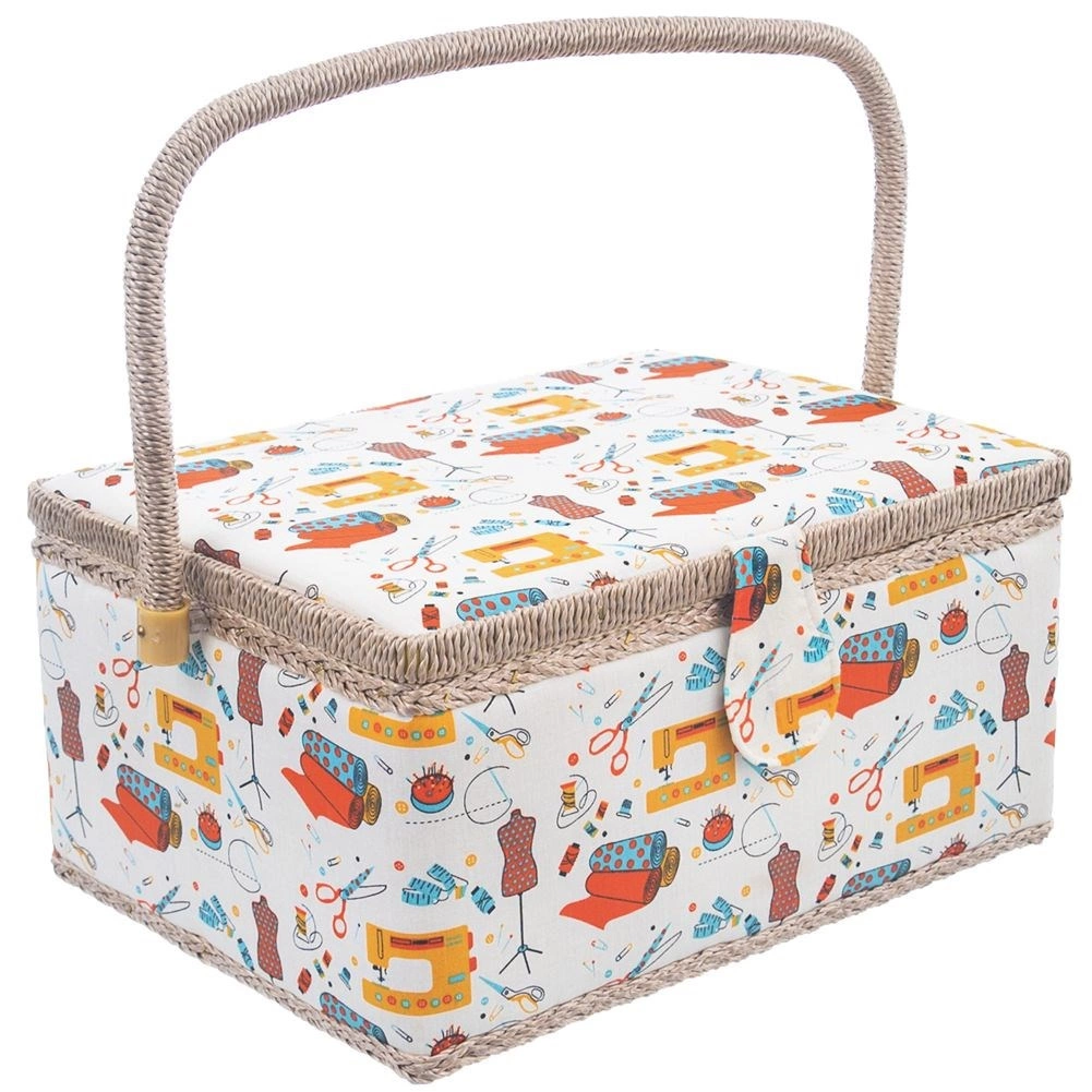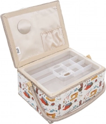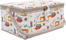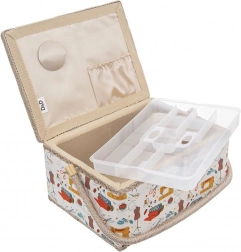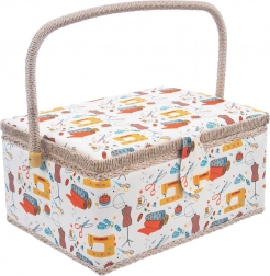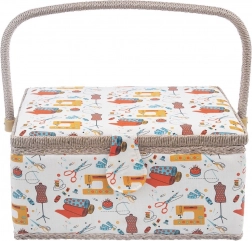 Elegáns varrókosár 30 × 23 × 16 cm méretben, amely praktikus rendszerezést kínál a cérnákhoz, tűkhöz és apró kellékekhez. Masszív felépítésű, szövetborítással szabászati mintával, lehajtható fogantyúval az egyszerű hordozáshoz és mágneses zárással a véletlen kinyílás ellen. Belül kivehető műanyag rendező található 7 rekesszel, valamint zseb és tűpárna a fedélben.