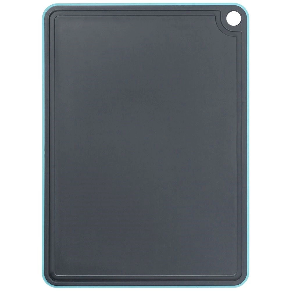 Praktikus szürke vágódeszka türkiz szegéllyel, 32 × 23 cm méretben, ideális a mindennapi ételkészítéshez. Tartós, nem nyeli el a szagokat, rendelkezik légyűjtő vájattal és csúszásgátló peremmel a stabilitásért. A felakasztó nyílásnak és a mosogatógépben moshatóságnak köszönhetően könnyen tisztítható és helytakarékos.