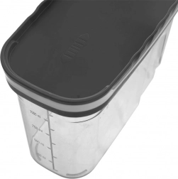 A doboz minőségi, tartós, BPA-mentes műanyagból készült elegáns szürke színben. -10 °C-tól +95 °C-ig ellenálló, mosogatógépben mosható és mikrohullámú sütőben használható (fedél nélkül). A praktikus 250 ml-enkénti mérce 250–1250 ml tartományban megkönnyíti a pontos kimérést főzésnél és sütésnél.